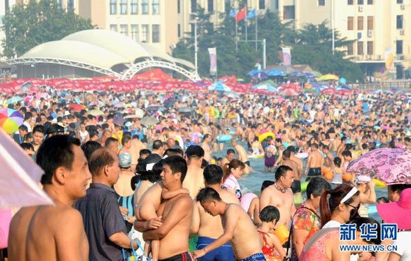 耐え難い酷暑 ビーチは人だらけ 青島 (2)