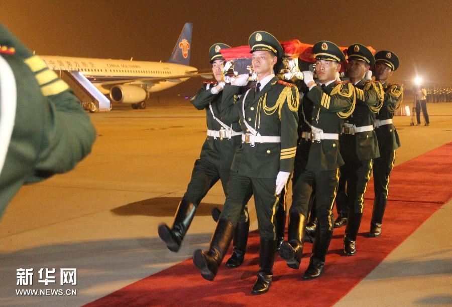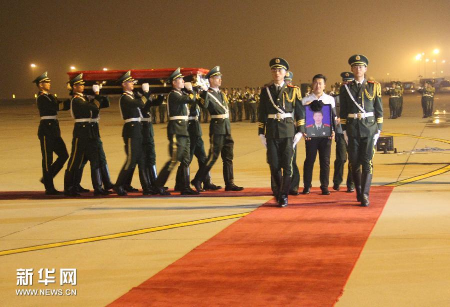 1日夜、式典警護(hù)兵に護(hù)送され、中國(guó)の國(guó)旗がかけられた張楠烈士の棺がゆっくりと航空機(jī)から降ろされ、霊柩車(chē)に移された。張氏は在ソマリア中國(guó)大使館のあるホテルへの自爆テロで犠牲になった大使館の警護(hù)擔(dān)當(dāng)者であり、武裝警察山東総隊(duì)臨沂小隊(duì)の武警上士。氏の棺を載せた航空機(jī)は1日夜、済南遙墻國(guó)際空港にゆっくりと著陸し、張氏を萬(wàn)里の果てから夢(mèng)にまで見(jiàn)た祖國(guó)へと連れ帰った。事件で負(fù)傷した武裝警察の趙団軍氏と王旗氏も同機(jī)で護(hù)送した。新華社が伝えた。(編集KS)