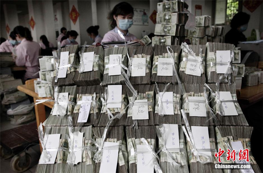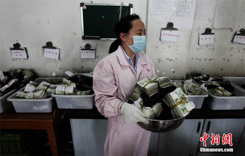 小銭を數(shù)えるとき、職員はテーブルに置かれた紙幣を額面ごとに分け、破損した紙幣または古い紙幣をまとめる。數(shù)えたお金は輪ゴムでとめ、硬貨は布袋に入れる。そして、紙幣はキャッシュレジスターで再び精算し、新?中?舊に分ける。硬貨は1元、5角、1角のものでそれぞれ分けて箱に入れる。