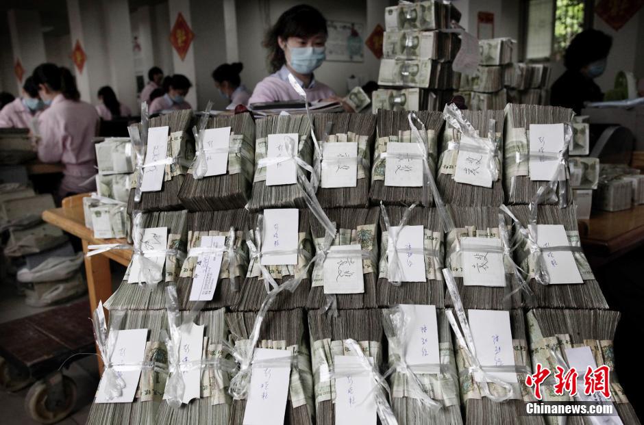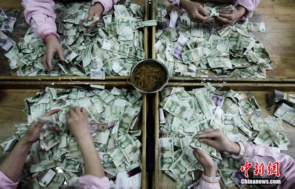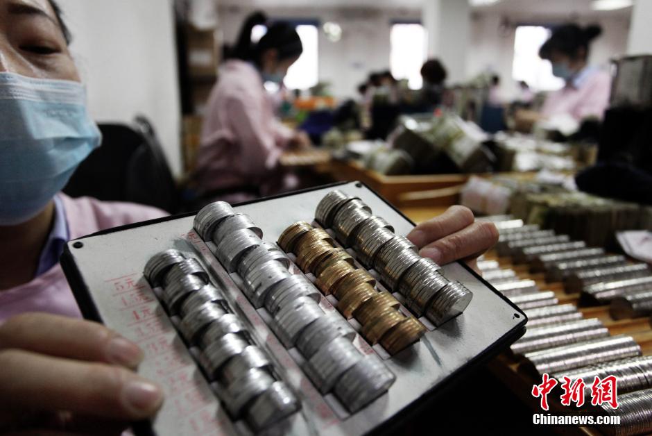 湖北省宜昌市路線バス売上センターの53人の小銭カウントを擔(dān)當(dāng)する女性スタッフたちはいつものように、前の日の夜に戻ってきた収集バッグの配布を開(kāi)始し、売上センターの忙しい一日がこうして始まった。寫真はスタッフが毎日カウントしなければいけない小銭の山。(編集JK)