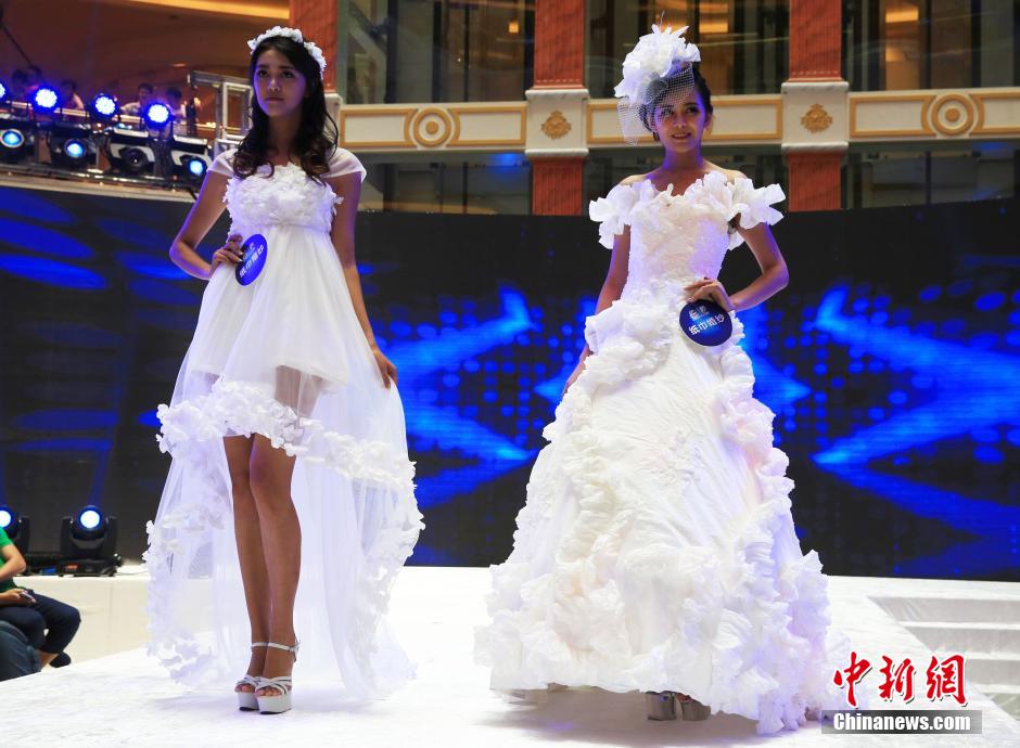 変わり種の「ブルー?ドリーム」ペーパータオルウェディングドレス展が上海で開幕し、維達(dá)紙業(yè)グループ(Vinda Paper Group)と中國國內(nèi)で有名なデザイナーの蘭玉(LAN YU)氏及び?xùn)|華大學(xué)ファッションデザイン學(xué)科の大學(xué)生たちが提攜し、30著以上のオシャレなペーパータオルウェディングドレスを発表した。蘭氏デザインの「東方美人」は肩が少し出ていて、マーメイドスタイルのスカートに中國式の花柄をあしらった紙でできた蝶を飾った個(gè)性的なデザインだ。