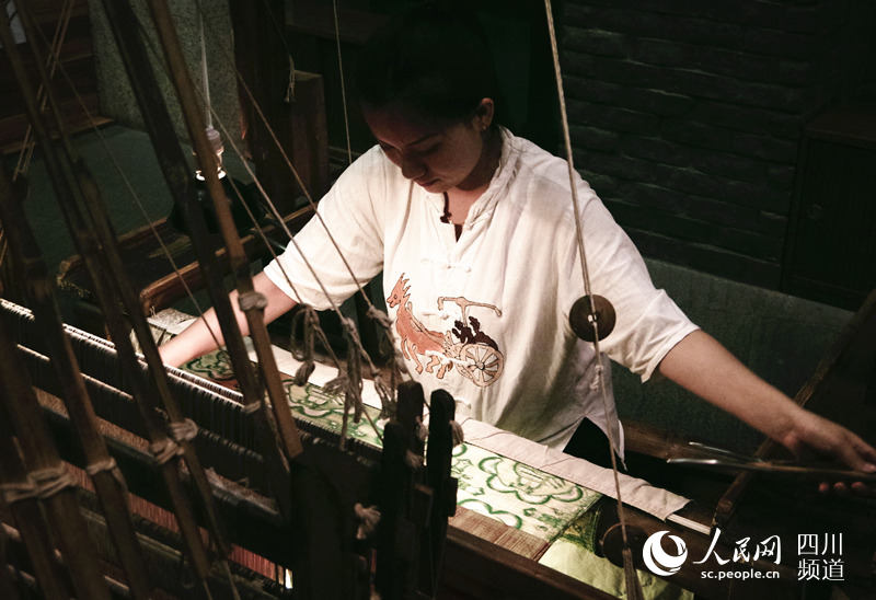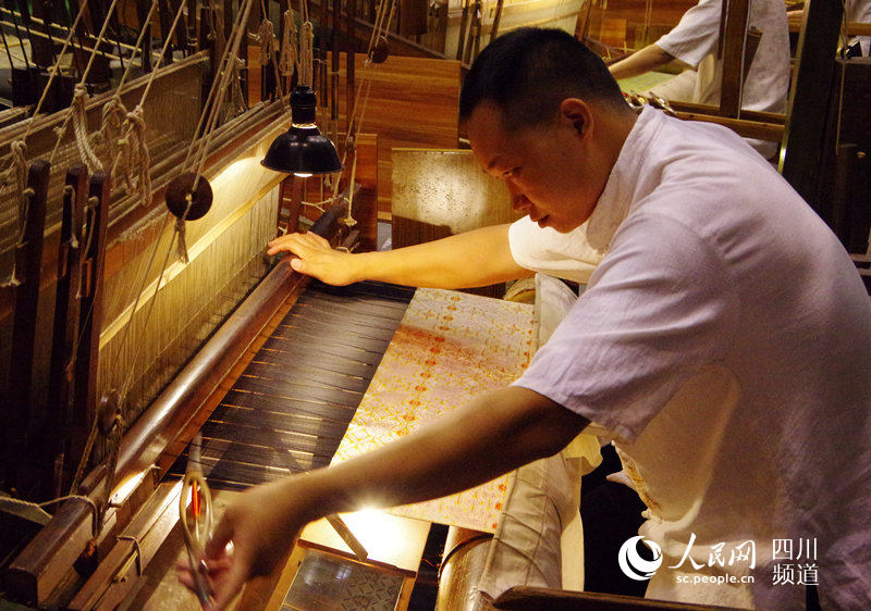 2006年、蜀錦刺繍の伝統(tǒng)技術(shù)は國務(wù)院の承認(rèn)を経て國家無形文化遺産に登録された。蜀錦(蜀江錦とも呼ばれる)は秦漢の時代に発祥し、唐宋の時代に繁栄し、明の時代の末期に衰退し、清の時代の中盤から末期に復(fù)活し、現(xiàn)代は再び危機(jī)に陥った。蜀錦の多くは正方形、帯狀で骨のような幾何學(xué)模様に花を添えた左右対稱の文様が鮮やかな色調(diào)と強(qiáng)く対比しており、漢民族の特色と地方の雰囲気を備えた多彩な織物である。
