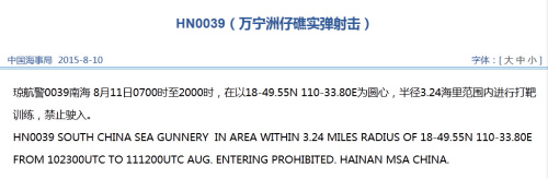 (1)8月11日午前7時(shí)から午後8時(shí)まで、萬寧洲仔礁周辺海域で実弾射撃を行う。18-49.55N 110-33.80Eを中心に半徑3.24カイリ內(nèi)で射撃訓(xùn)練を行う。