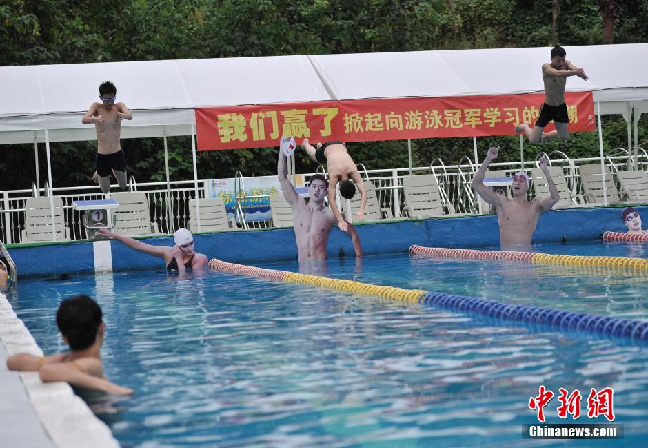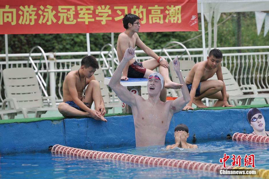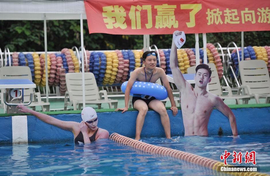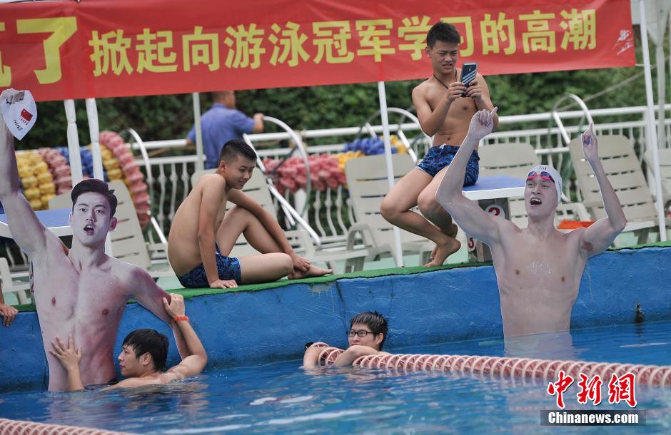重慶市にあるテーマパークの洋人街のプールで8月10日、フィットネスのためプールに來る市民が水泳優(yōu)勝者を見習(xí)って頑張るように、有名な中國代表の孫楊選手、寧沢濤選手らの寫真が飾られた。(編集JK)