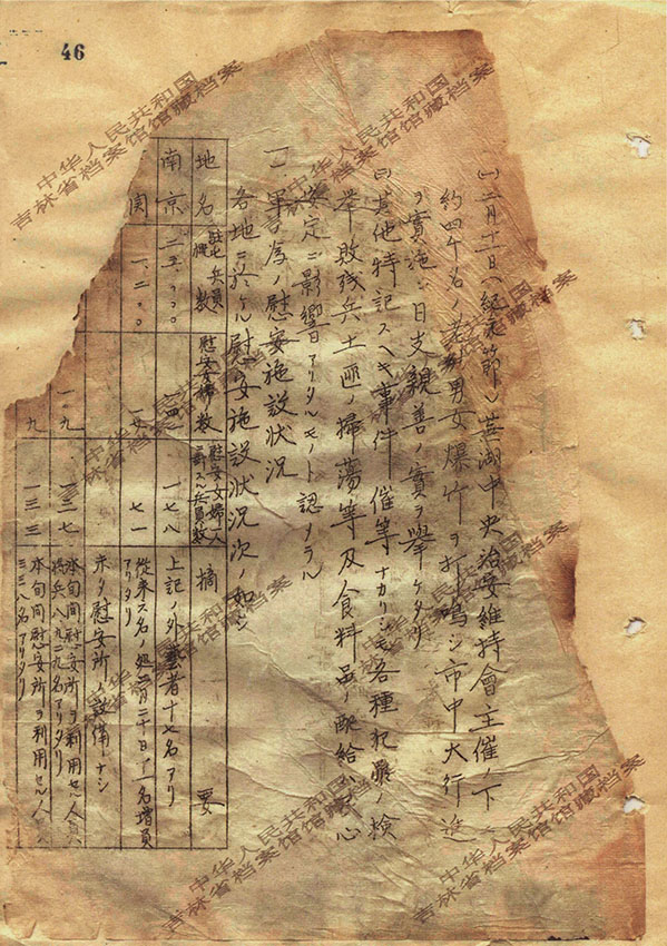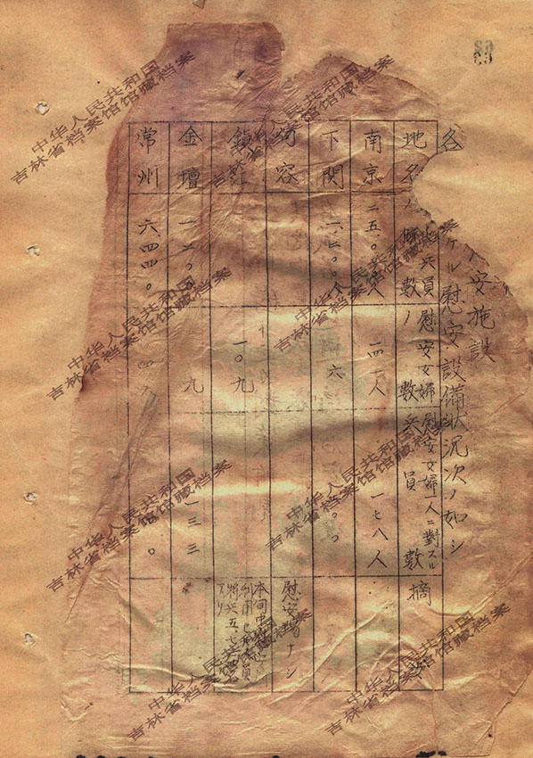 この公文書は昭和13年(1938年)2月19日に日本軍華中派遣憲兵隊(duì)の大木繁司令官が出した『南京憲兵隊(duì)管轄區(qū)治安回復(fù)狀況に関する調(diào)査報(bào)告(通牒)』で、同年2月1日から10日まで、南京および周辺地區(qū)の各市と県にある軍隊(duì)の「慰安施設(shè)」の狀況がまとめてある。南京、下関、句容、鎮(zhèn)江、金壇、常州、丹陽(yáng)、蕪湖、寧國(guó)などで、各地の日本軍の數(shù)、「慰安婦」の數(shù)、「慰安婦」1人が分擔(dān)される兵士の人數(shù)、「慰安婦」の構(gòu)成、10日間「慰安所」を利用する兵士の數(shù)などの狀況が含まれている。日本軍は侵略軍部隊(duì)に一定の割合で「慰安婦」を分配していた。當(dāng)時(shí)、南京には日本軍2萬(wàn)5000人、「慰安婦」は141人、「慰安婦」1人に分擔(dān)された兵士の數(shù)は178人。