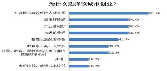 海外からの帰國(guó)者が起業(yè)する都市として選択する際に考慮に入れる點(diǎn)として、その都市が比較的良好な人脈があるどうかが66.7%を占め、産業(yè)基盤、市場(chǎng)の見(jiàn)通し、都市環(huán)境が50%を占めている。その次には基礎(chǔ)設(shè)計(jì)、教育水準(zhǔn)、インセンティブ政策への関心と続く。これらを比べてみると、住宅価格と営業(yè)コストは起業(yè)者が起業(yè)する都市を選択するのにあまり影響がない。