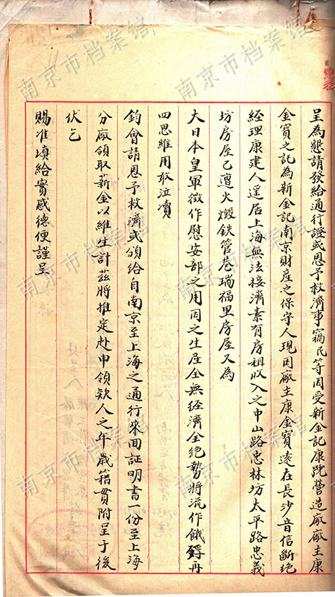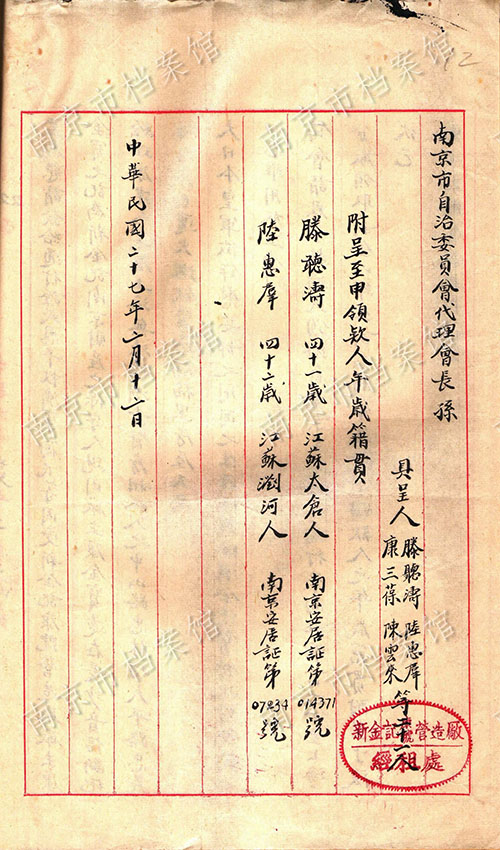 (1)1938年2月2日、民家が日本軍に接収されて慰安部に用いられていることに関して滕徳濤らが救済を求めた上申書で、南京市公文書館所蔵。