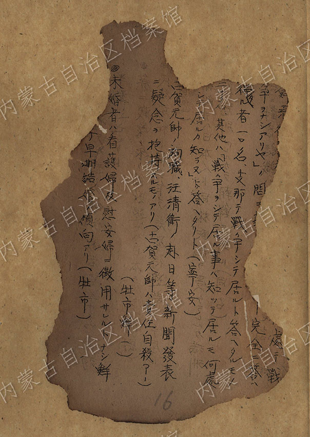 (4)1944年6月30日、「未婚女性を看護(hù)婦や慰安婦として召集するため、朝鮮は明らかな早婚傾向を呈している」と記した傀儡満州國(guó)第六憲兵団『高等警察期報(bào)』で、內(nèi)蒙古自治區(qū)公文書館所蔵。