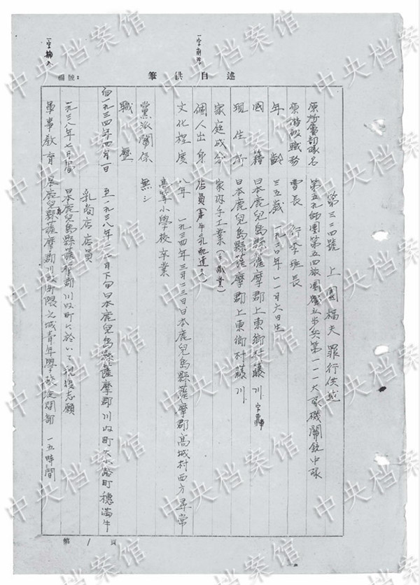 國家公文書局はは18日、公式サイトで『中國侵略日本人戦犯供述書選』(八)--日本人戦犯?上園福夫の供述書を公開した。