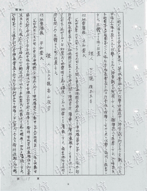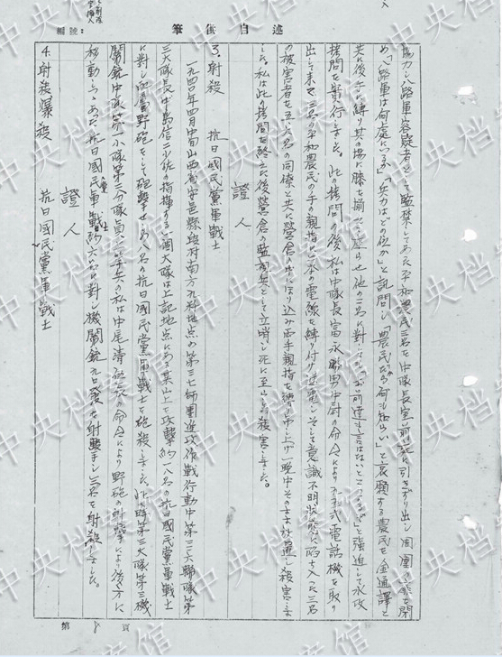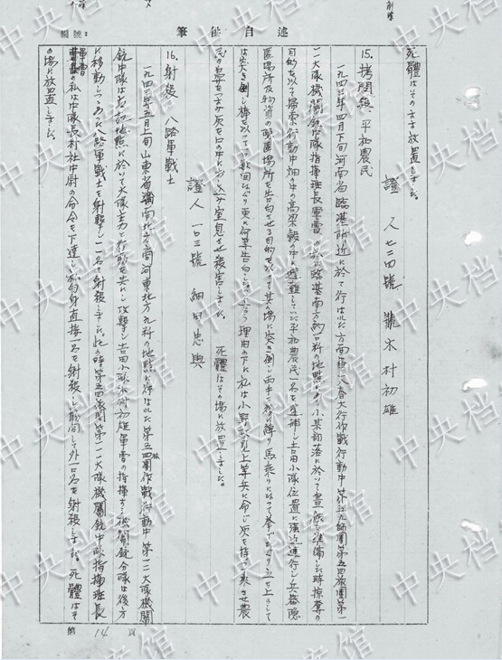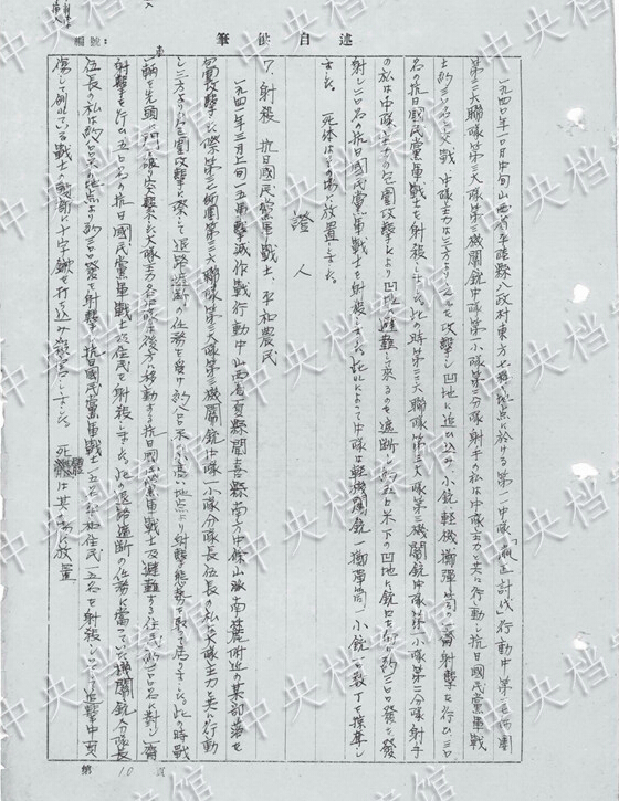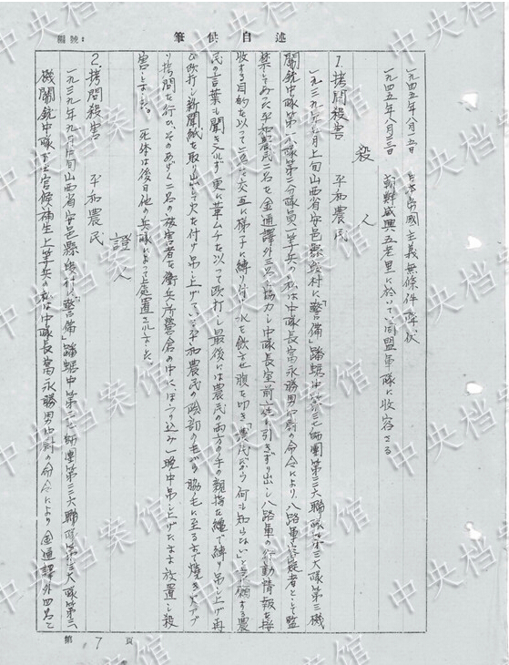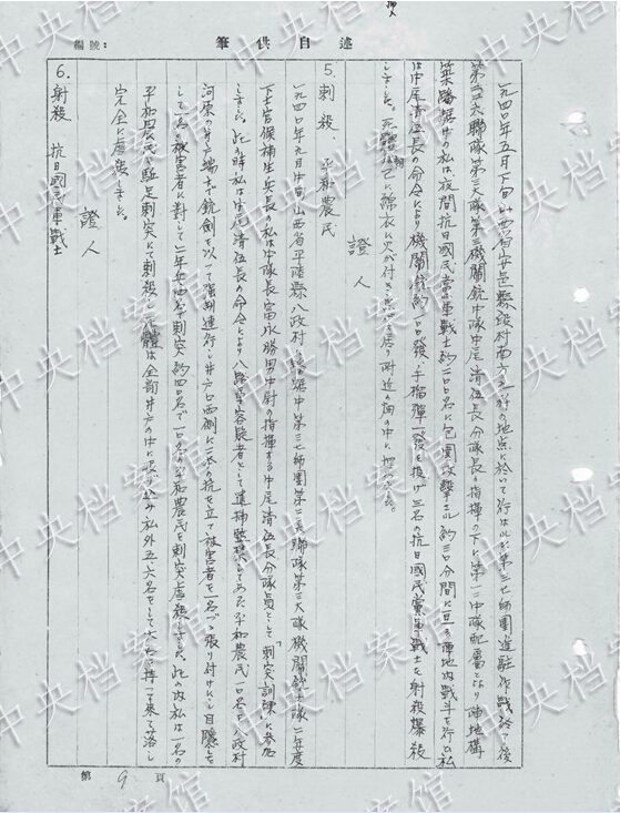 1940年9月、山西省平陸県の刺殺訓(xùn)練で「兵士約40人で農(nóng)民10人を殺害した」?!杆饯?人の農(nóng)民を駈足刺突にて刺殺」した。