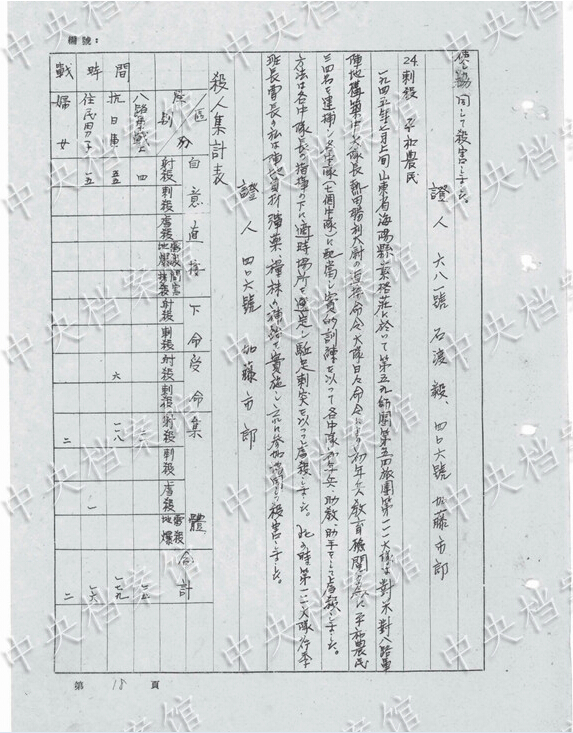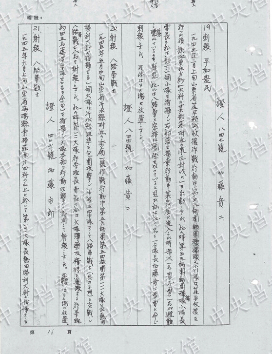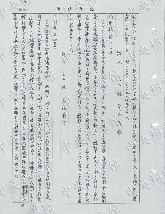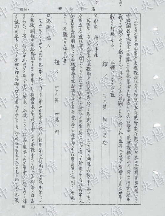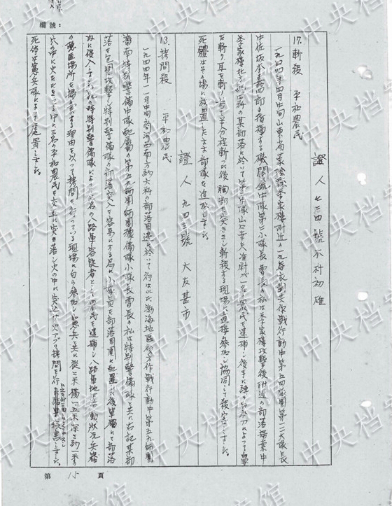 1942年12月、山東半島のある村で、約48歳の女性を見つけた。ほかの兵士1人が「日本刀で女性のひざと太ももあたりを突っつき、むりやりに陰部を開かせ暴行した。このとき、私は室內(nèi)にあった長さ約1メートルのコーリャンのわらを取り出し、陰部に突き刺し20數(shù)回かき回した」。女性はその後大量の失血で死亡した。