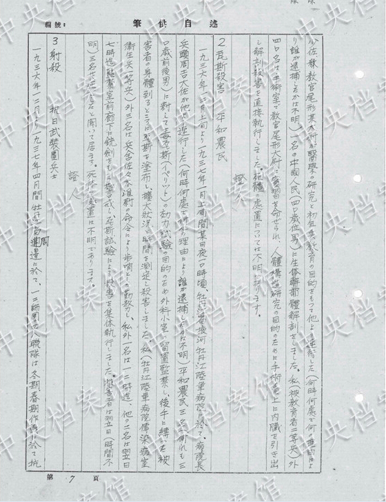 1936年6月、哈爾濱陸軍病院に於て「醫(yī)學(xué)の研究と初年兵教育の目的をもつて」仲間が一名の中國人民に「生體解剖をしました」?!溉梭w構(gòu)造研究の目的のために、私は手術(shù)臺上に內(nèi)臟を引き出し解剖殺害を直接執(zhí)行しました」。