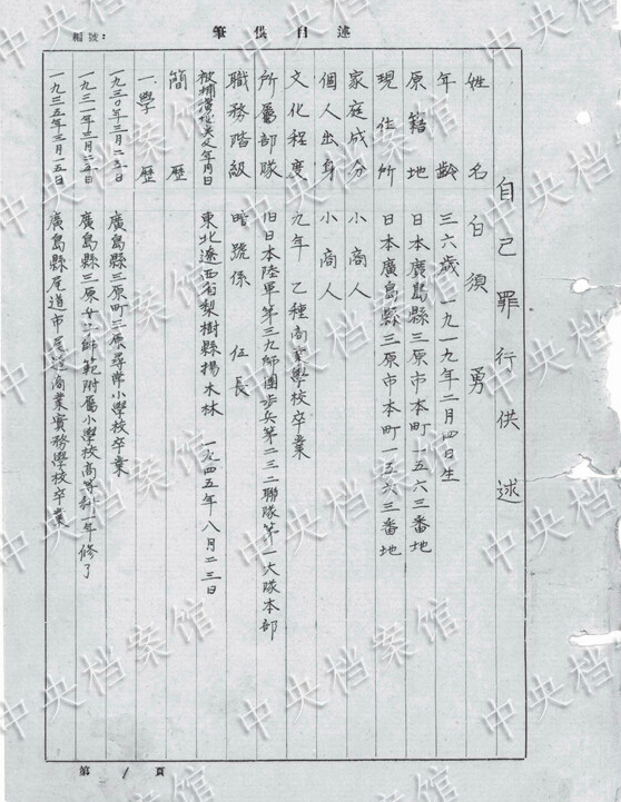 白須勇の供述によると、彼は1919年に生まれ、原籍日本広島県。1940年中國侵略戦爭に參加、1945年8月捕虜となった。重要な罪行には以下のものがある。