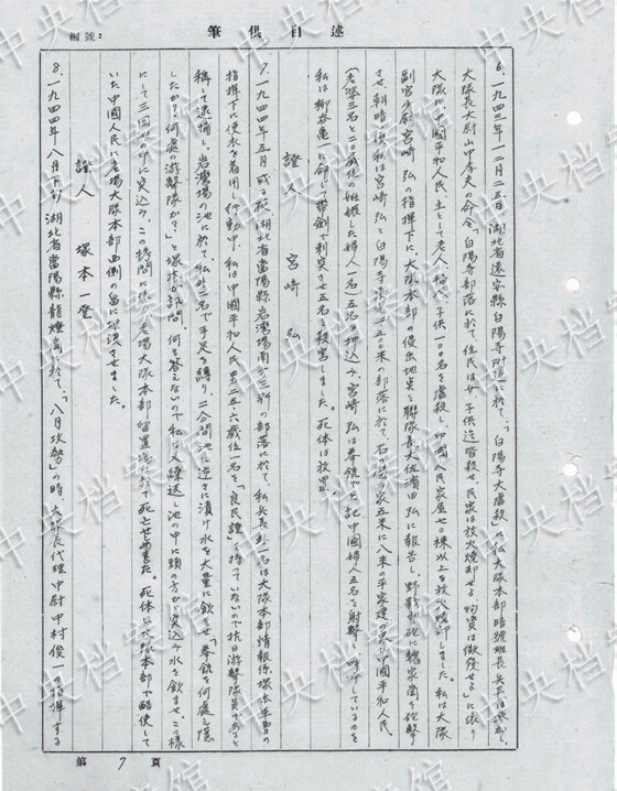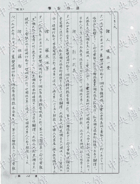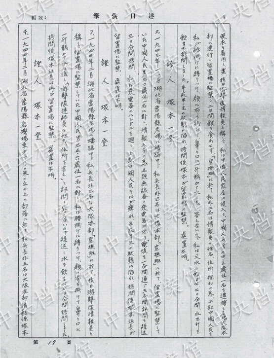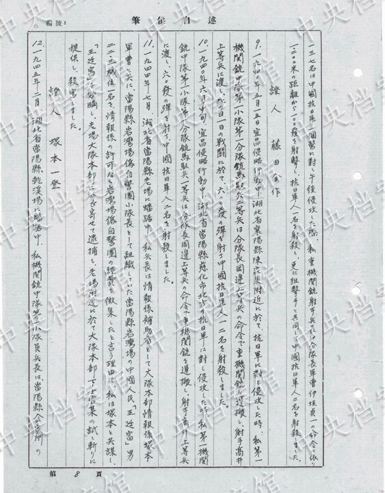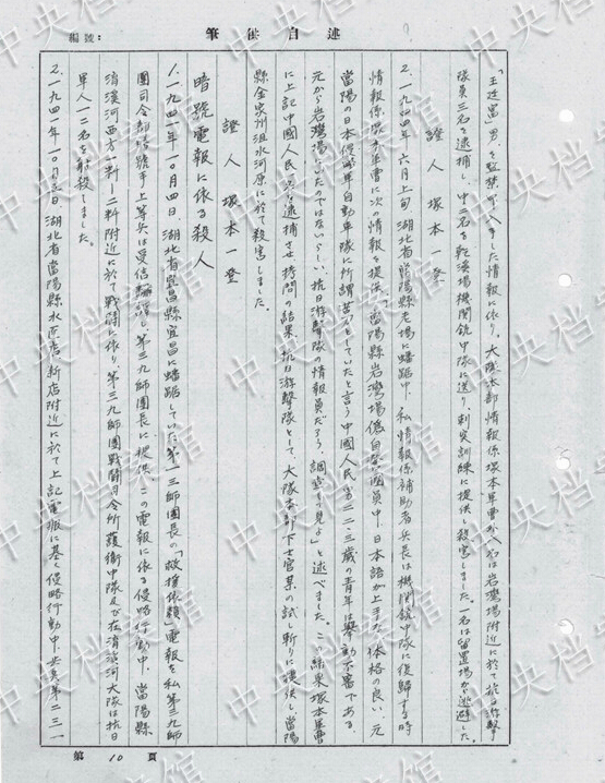 1944年5月、當(dāng)陽県において、中國平和人民男一名を逮捕し「私外二名で手足を縛り、二合間池に逆さに漬け水を大量に飲ませ…三回池の中に突込み…死亡せしめました」。