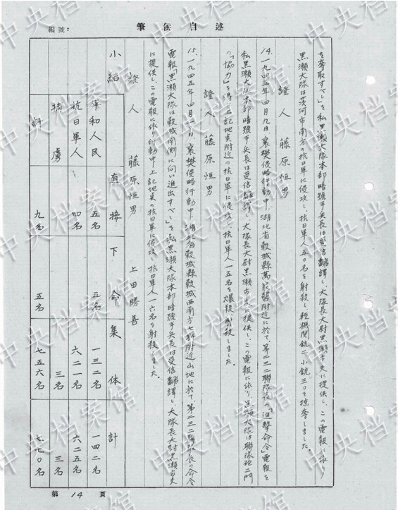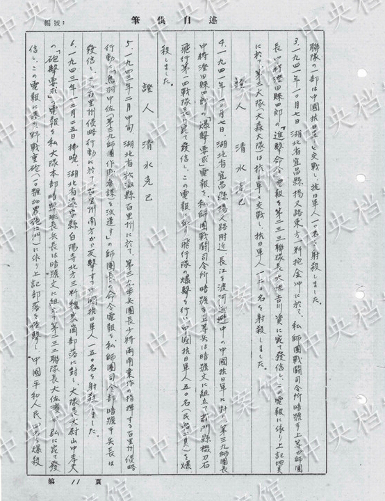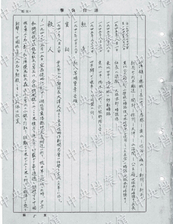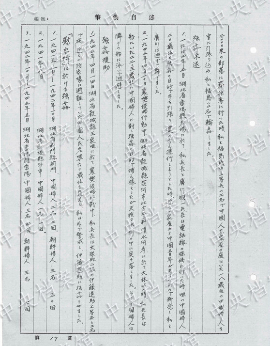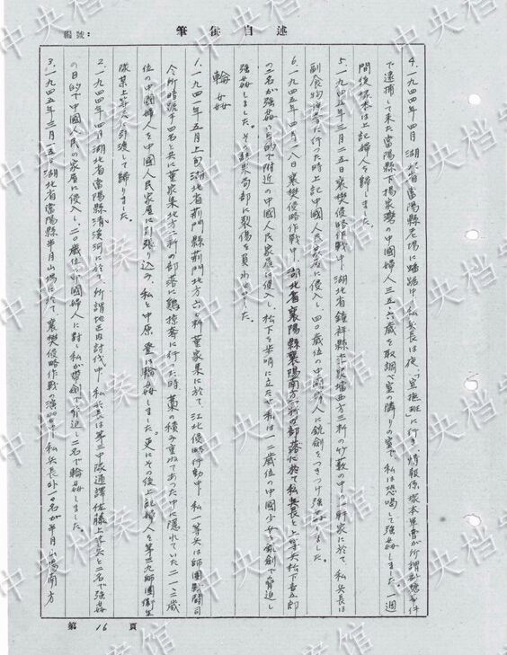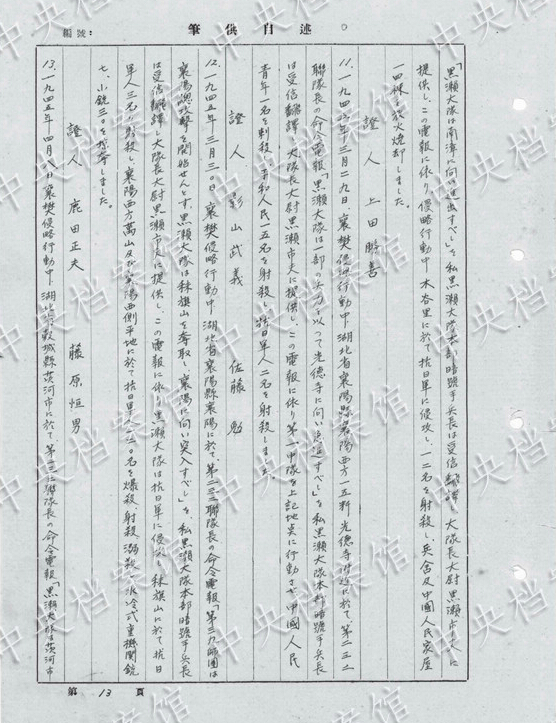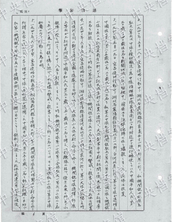 1940年6月、湖北省荊門県において「中隊(duì)の歩哨某が逮捕した中國平和人民男三五、六歳位一名を…私…は銃剣で刺殺しました」。