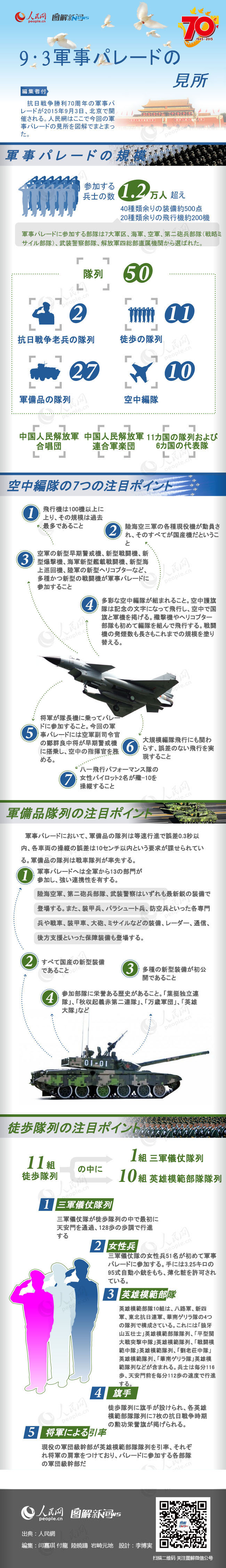 抗日戦爭勝利70周年の軍事パレードが2015年9月3日、北京で開催される。今回の軍事パレードは「抗日戦爭の偉大な勝利を記念し、抗日戦爭の偉大な精神を発揚し、民族の偉大な復(fù)興を?qū)g現(xiàn)する」であり、平和的発展路線を確固不動として歩み、世界平和を確固不動として維持し、國家の主権、安全、発展上の利益を守る中國の斷固たる立場をはっきりと示し、世界反ファシズム戦爭における中國人民の多大な民族的犠牲と重要な歴史的貢獻(xiàn)をはっきりと示し、軍事力強(qiáng)化目標(biāo)の貫徹と近代化の推進(jìn)における中國軍の新たな成果および威武の部隊、文明の部隊としての良きイメージを示すことが目的だ。人民網(wǎng)はここで今回の軍事パレードの見所を図解でまとまった。(編集LX)