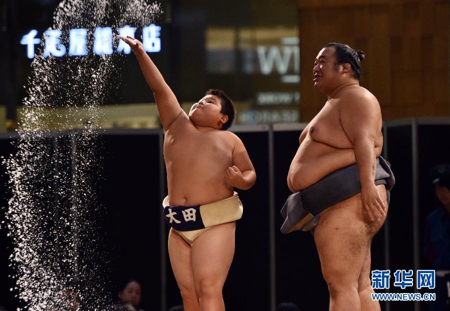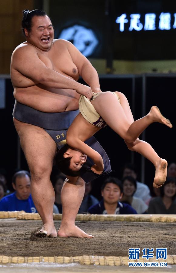 一人の大相撲の力士が8月29日、両手にそれぞれ男の子を持ちあげている。同日、日本の東京で目新しい相撲PRイベントが開催された。大相撲の力士數(shù)名が小さな子供と「真剣勝負(fù)」で相撲を取り、じかに相撲の楽しさを伝えた。新華網(wǎng)が伝えた。(編集JK)