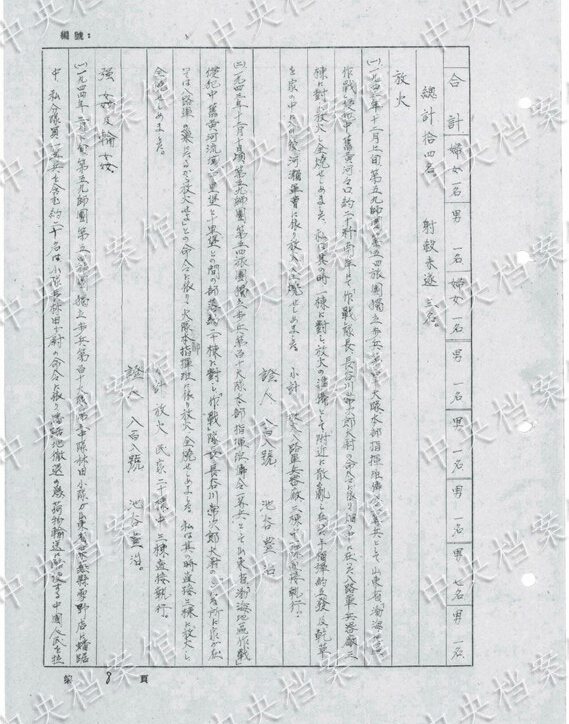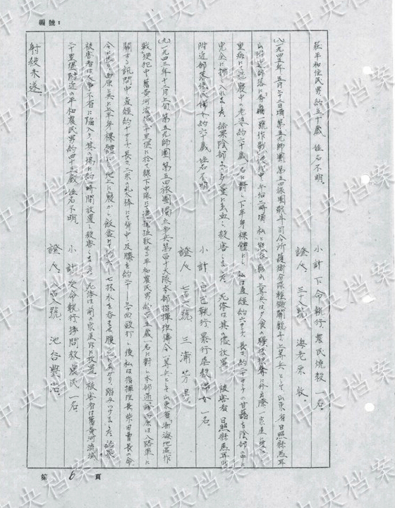 1944年5月、山東省徳弦県の駐在地において「中國人民老婆約六十五歳(相當(dāng)衰弱して居りました。)一名が私の約六十サンチの所に接近して來たので」「小銃にて胸部を突き飛ばしました結(jié)果、被害者は一米位後方に転倒し、約一分間位してようやく起ちあがり、ヨロヨロし乍ら約五十米歩行し畑の中にて死亡しました」。