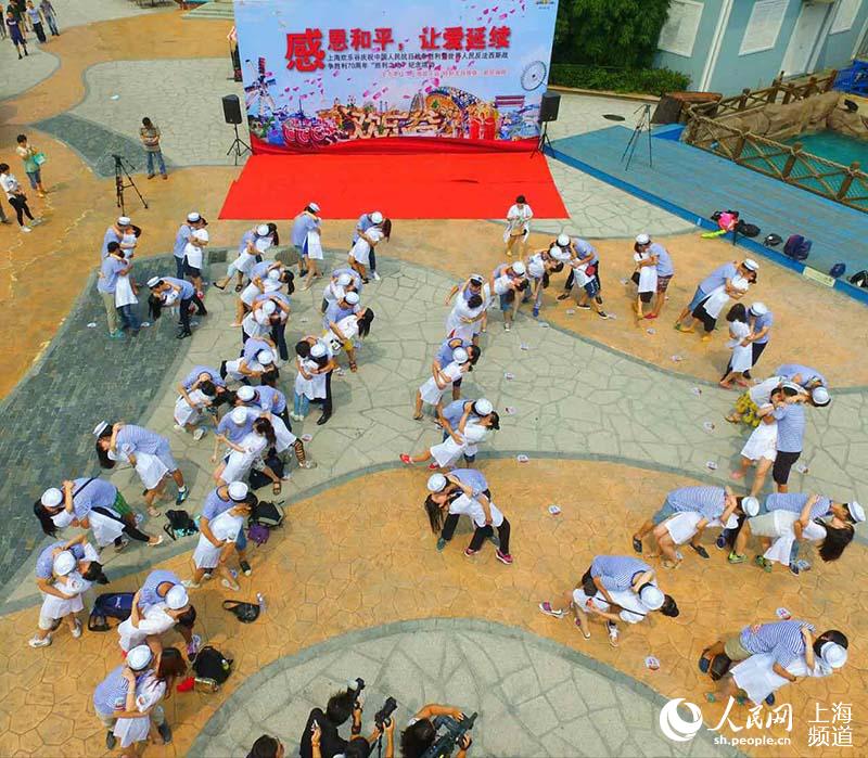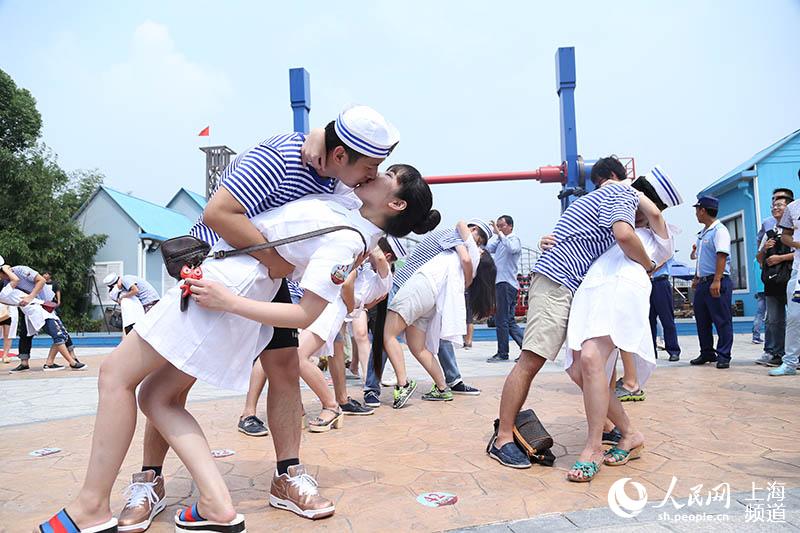 中國(guó)人民抗日戦爭(zhēng)ならびに反ファシズム戦爭(zhēng)勝利70周年記念にちなんで、70組のカップルが30日、上海市の歓楽谷(ハッピーバレー)のリニューアルした颶風(fēng)灣(ハリケーンベイ)でロマンティックなキスを披露し、第2次大戦終了時(shí)の1945年、ニューヨークのタイムズスクエアでの「世紀(jì)のキス」を再現(xiàn)した。人民網(wǎng)が伝えた。
