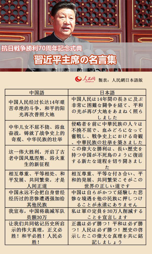 中國(guó)人民抗日戦爭(zhēng)ならびに世界反ファシズム戦爭(zhēng)勝利70周年記念式典が3日午前10時(shí)、天安門広場(chǎng)で開催された。習(xí)近平中共中央総書記(國(guó)家主席、中央軍事委員會(huì)主席)が重要談話を発表した。
