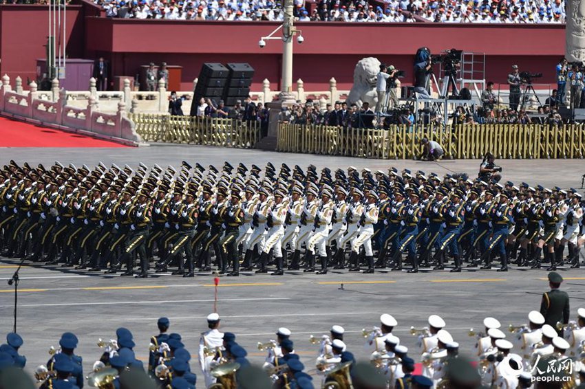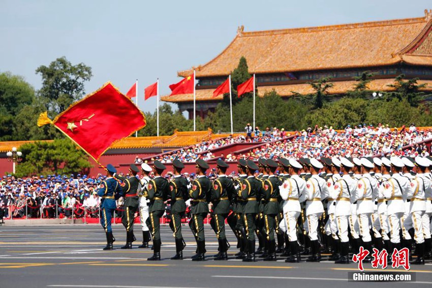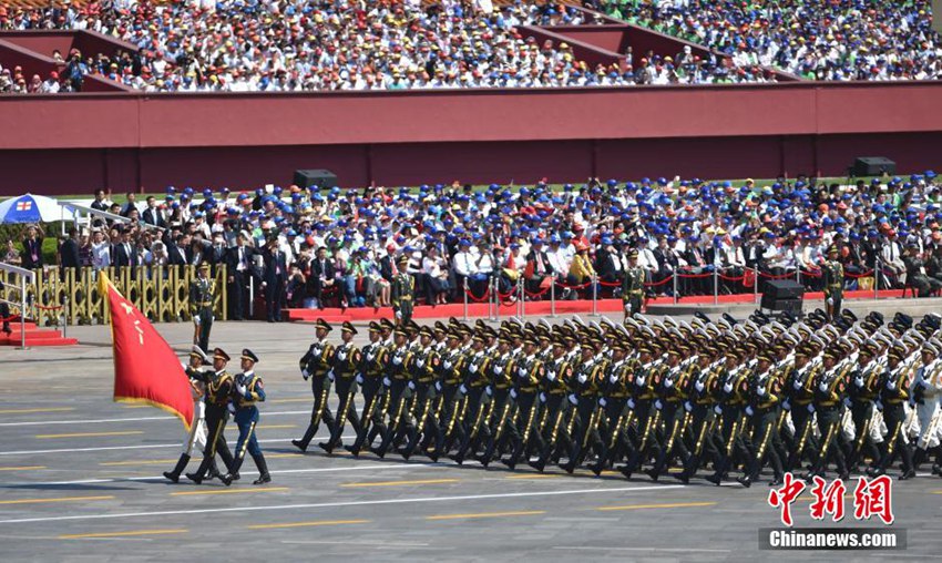中國人民抗日戦爭ならびに世界反ファシズム戦爭勝利70周年記念式典が9月3日に行われ、中國人民解放軍三軍儀仗隊(duì)が天安門広場を通過した。(編集XM)