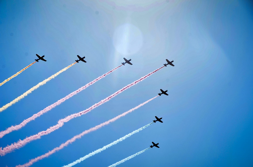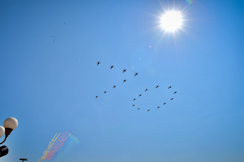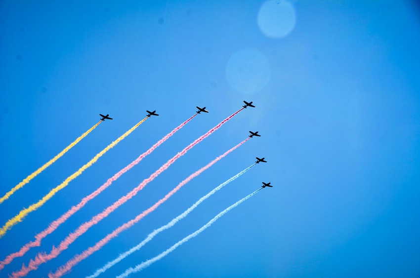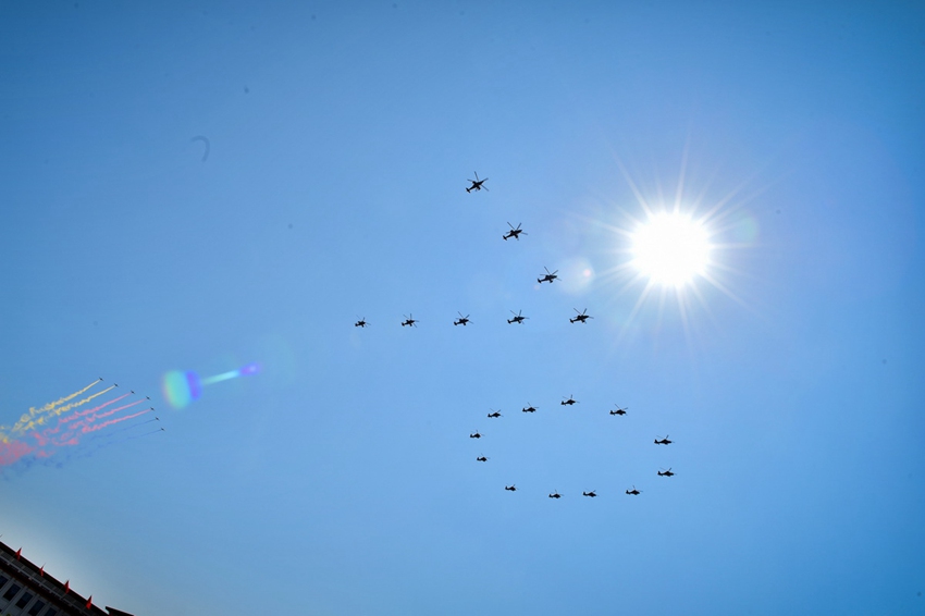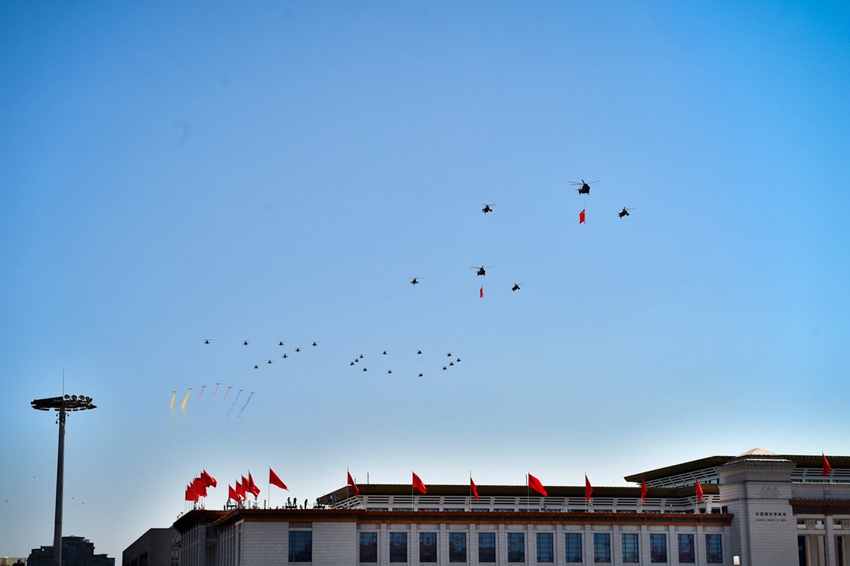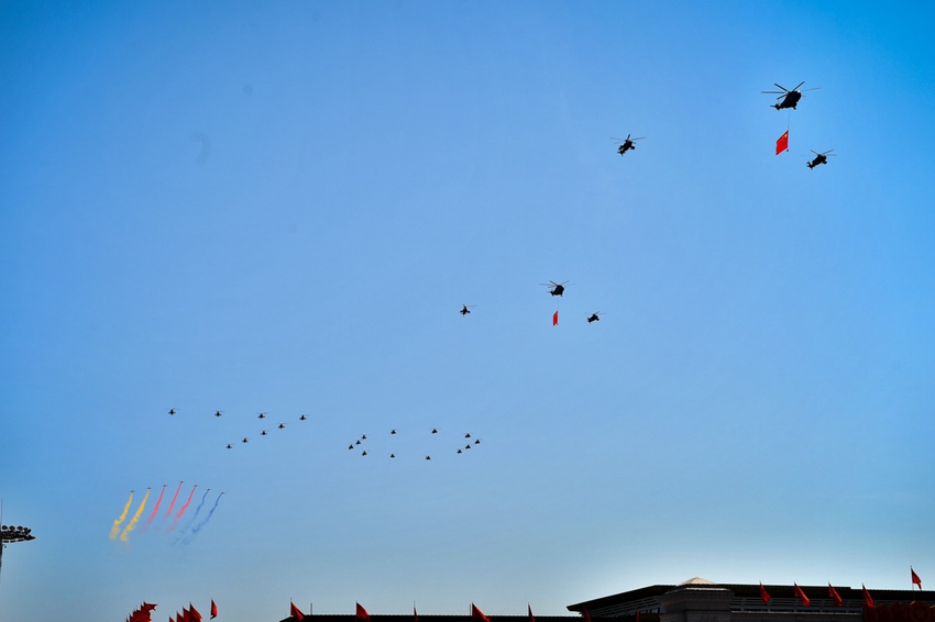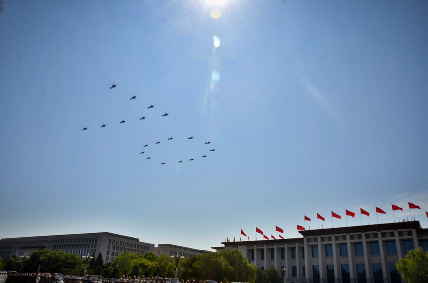 中國人民抗日戦爭ならびに世界反ファシズム戦爭70周年記念日の9月3日午前10時(shí)に北京の天安門広場で記念式典が開催された??罩凶o(hù)旗編隊(duì)が中華人民共和國國旗と中國人民解放軍軍旗を掲げ、真っ先に天安門上空を通過した。(編集XM)