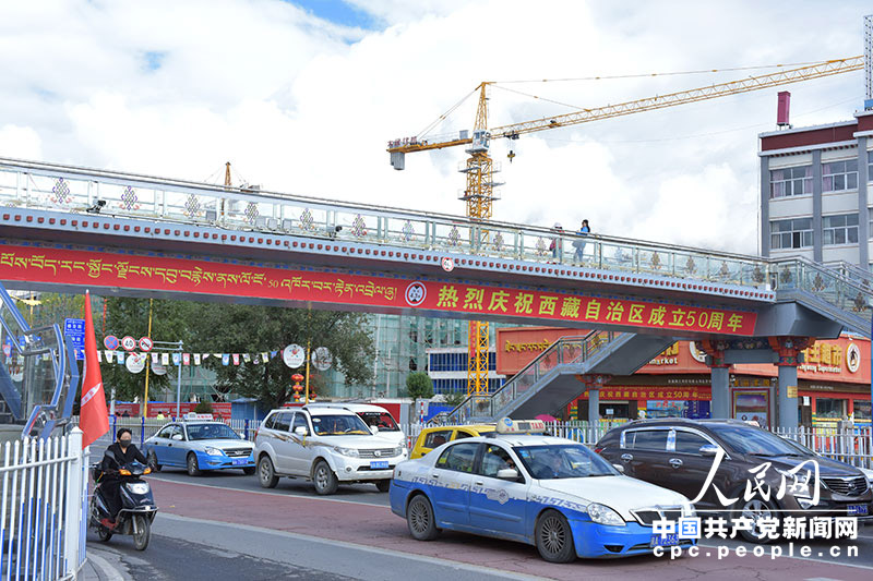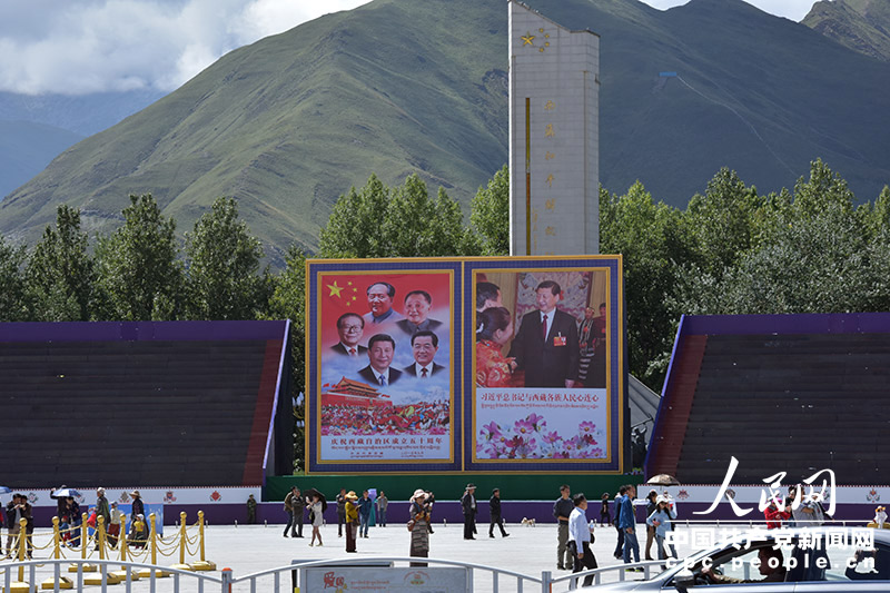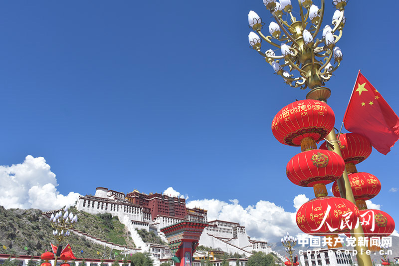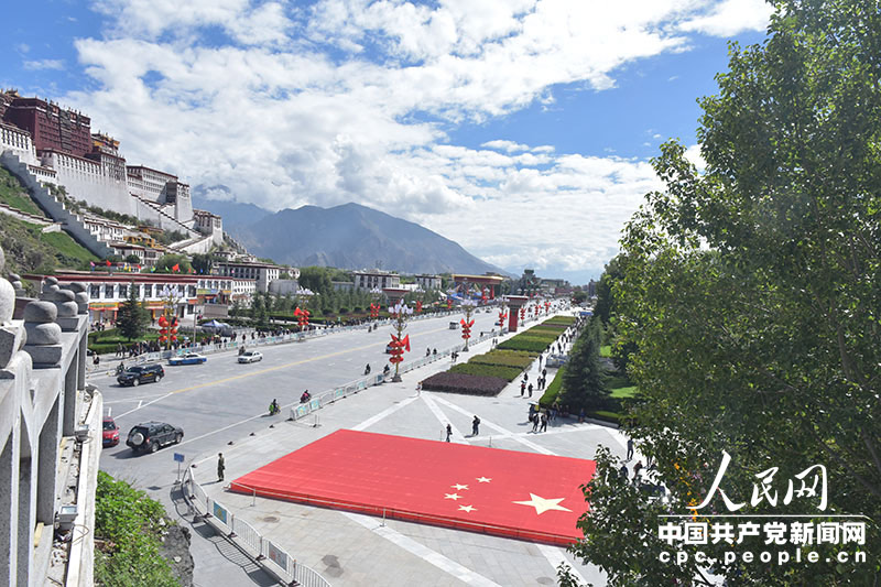 ポタラ宮広場(chǎng)の裝飾は一新され、トゥルナン寺(大昭寺)も念入りな飾り付けが施され、「西蔵自治區(qū)成立50周年を熱烈に祝賀する」という標(biāo)語と赤い提燈が寺院の壁に掛けられ、広場(chǎng)には美しい花が咲き亂れている。