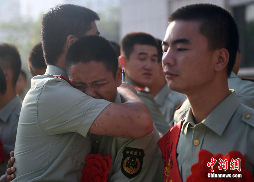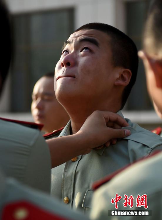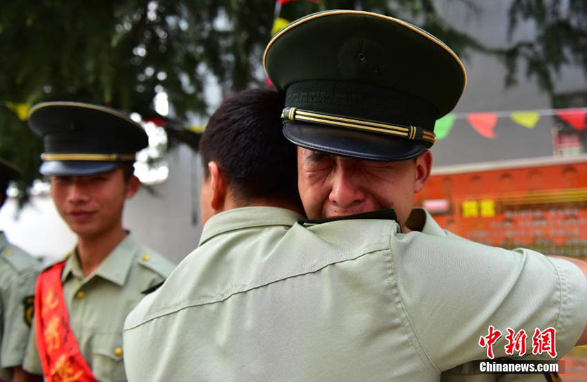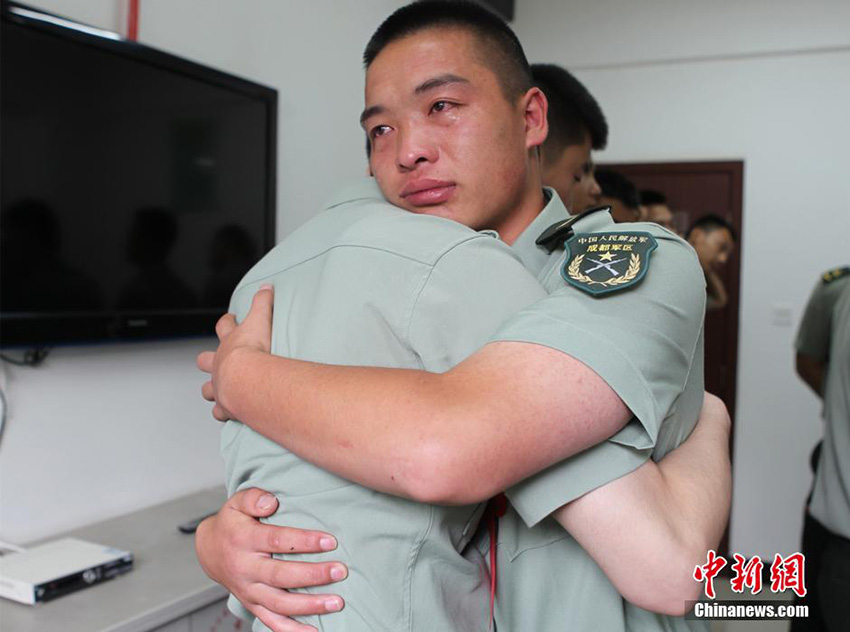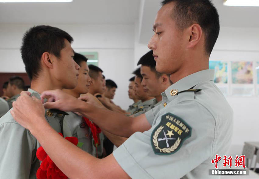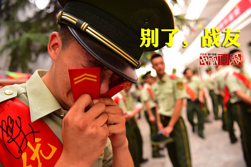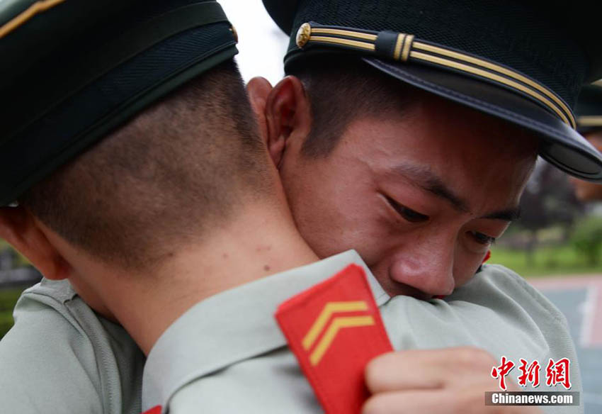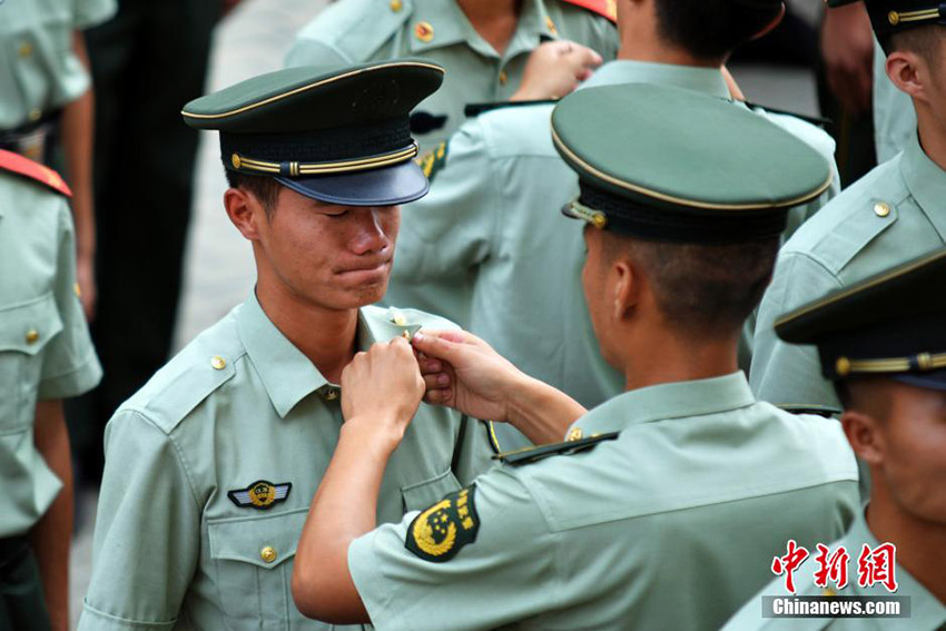 武裝警察安徽総隊(duì)第二支隊(duì)七中隊(duì)の駐屯地で1人の退役軍人が階級(jí)バッジに口づけするとき涙がこぼれ落ちた。同日、武裝警察安徽総隊(duì)第二支隊(duì)の各下部中隊(duì)は退役軍人の階級(jí)バッジ返還式を行なった。今年、中國(guó)軍は「一徴両選両退」政策(新兵の年1回の採(cǎi)用、士官の年2回の改選、任期満了の兵士の年2回の退役)を?qū)g施し、2013年度秋季入軍の第一陣兵士たちは9月4日をもって次々と兵舎に別れを告げ、戦友との別れを惜しみ、故郷に錦を飾り、新たな人生のステージへと旅立っていく。(編集JK)