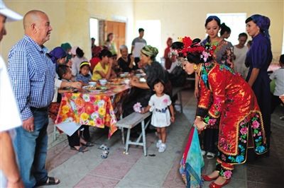 結(jié)婚披露宴が終わりに近づくと、新婦アシェラさんは、新郎の伯父にお辭儀をする。アシェラさんは、風(fēng)習(xí)の通りに、両手に挾んだハンカチを揃え、腰を90度に屈めたお辭儀を3回繰り返した。