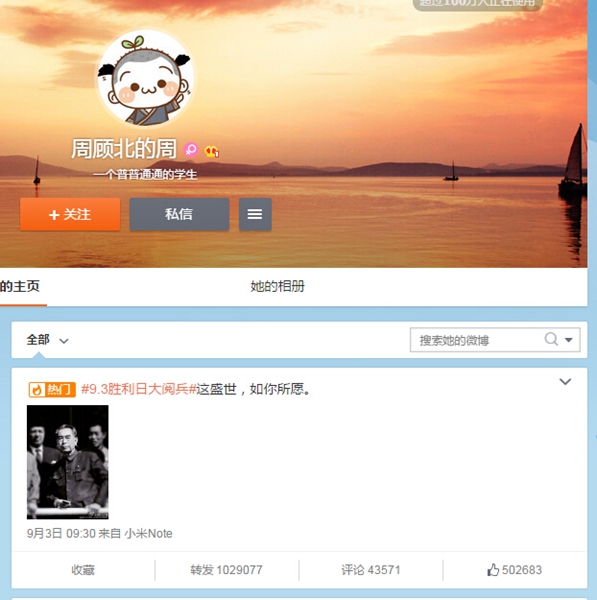 3-5日の間、最も注目を集めたのは誰なのだろう?同期間、ネットユーザーが最も注目していたのは、「抗日戦爭元兵士」だった。新浪微博がCCTVと共同で行った「元兵士に敬禮」というキャンペーンの閲覧數(shù)は8日午前8時の時點で、8億4千萬回に到達。蕓能人など有名人130人以上も參加した。