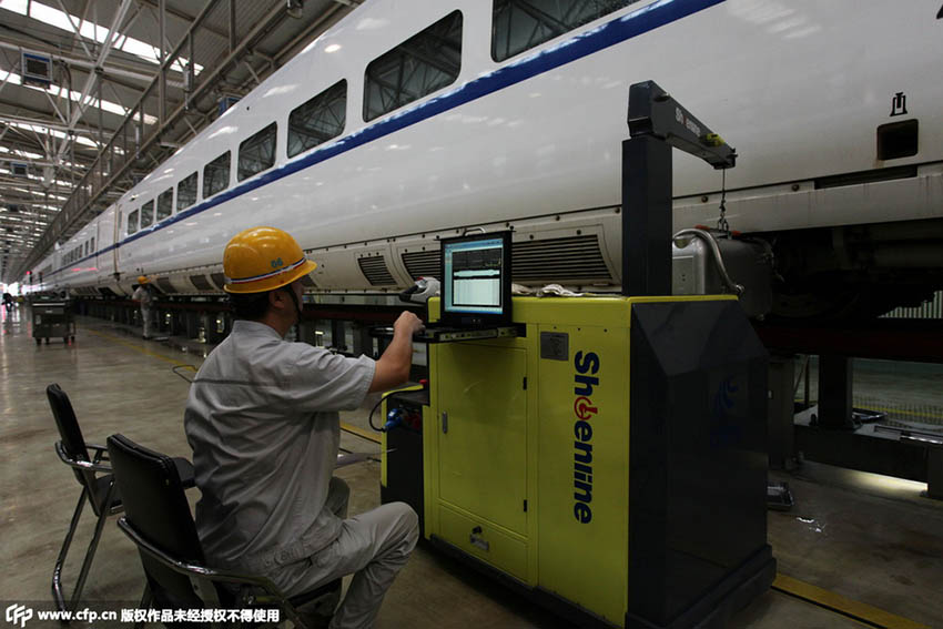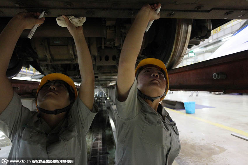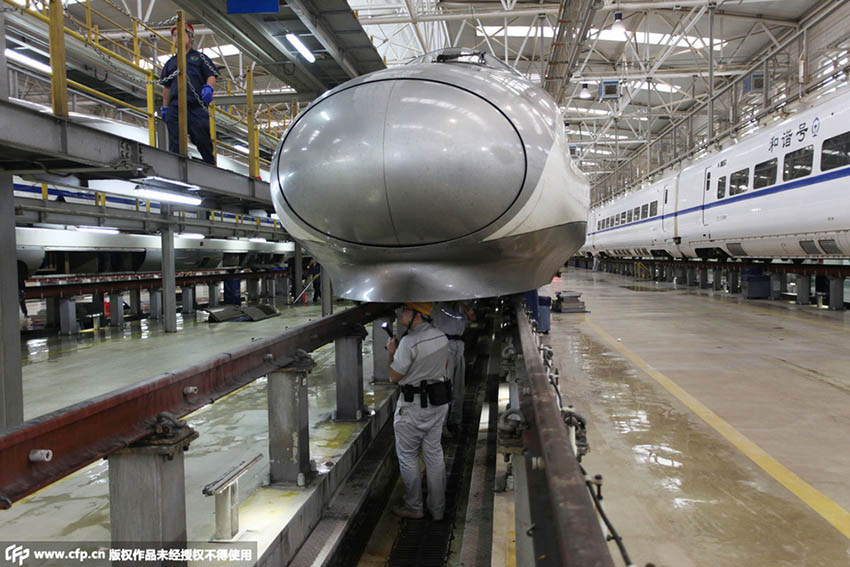陝西省西安市北部郊外の西安高速列車(chē)運(yùn)輸區(qū)で9月10日、運(yùn)輸區(qū)の西に「列車(chē)の整備場(chǎng)」と呼ばれる高速鉄道列車(chē)運(yùn)用所がある。列車(chē)が帰庫(kù)してからどのように修理點(diǎn)検し、クリーニングして出庫(kù)していくのか、一連の流れをカメラに収めた。人民網(wǎng)が伝えた。