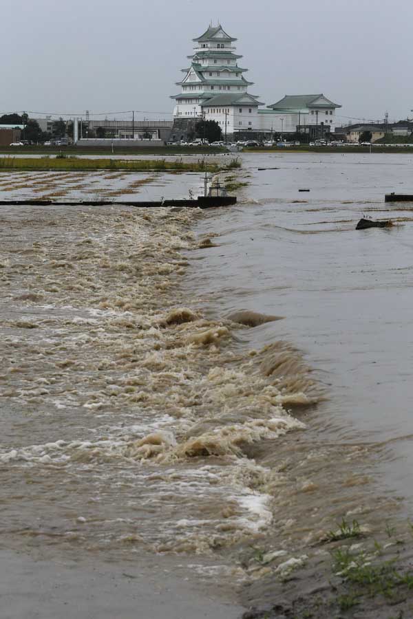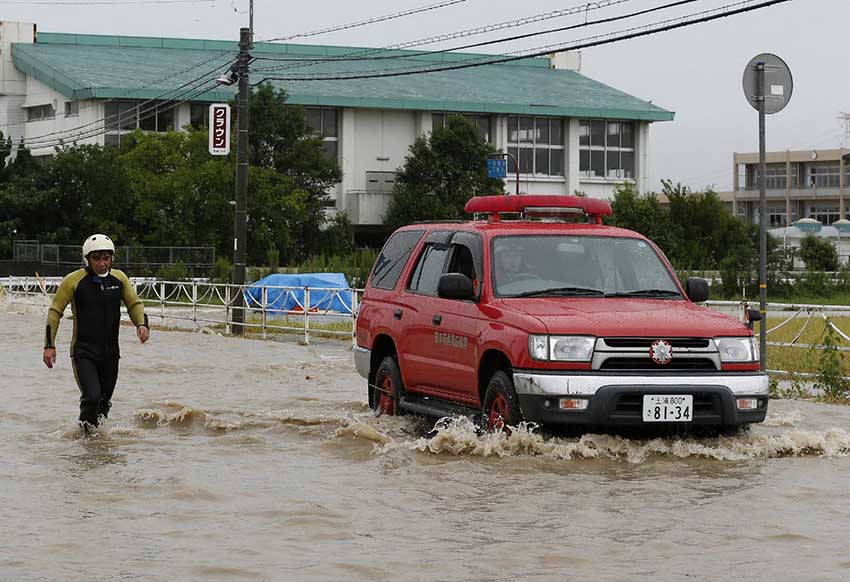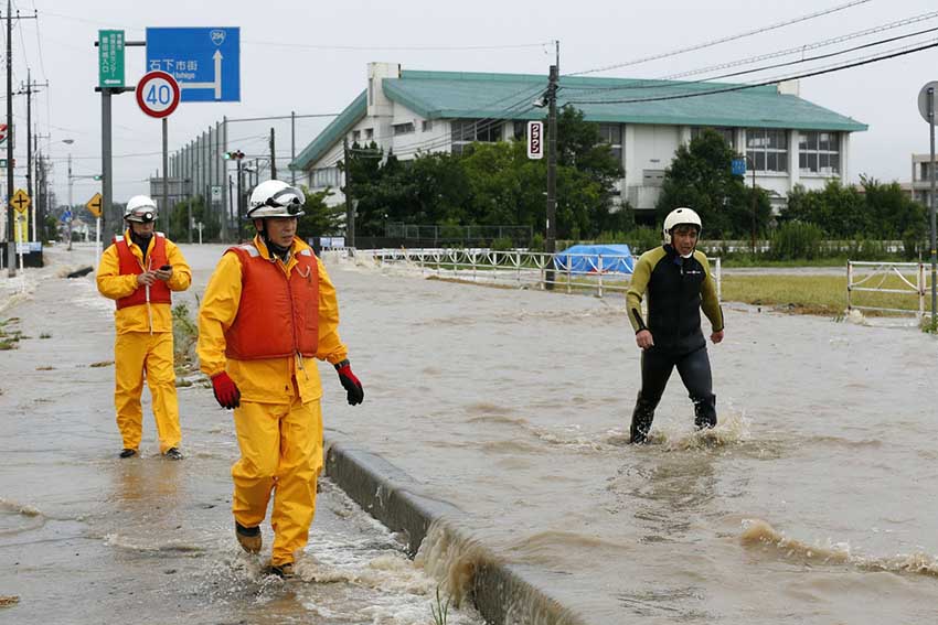 日本の茨城県常総市で9月10日、消防隊(duì)員が洪水で浸水した道路を歩いている。臺風(fēng)18號「 アータウ」の影響で、日本は暴風(fēng)雨に見舞われ土石流が発生した。日本當(dāng)局は10日、日本中部全域數(shù)萬人に緊急避難勧告を発令していた。(編集JK)