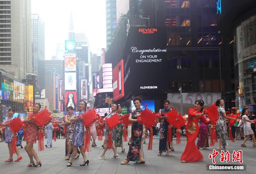 米ニューヨーク?タイムズスクエアで10日、美しいチャイナドレスを身につけた女性100人がフラッシュモブを?qū)g施した。世界各地から訪れた観光客は、「世界の交差點」で中國の美しい伝統(tǒng)衣裝を堪能した。在ニューヨーク中國副総領(lǐng)事の張美芳氏は「チャイナドレスは中國の伝統(tǒng)的な民族衣裝。私も今回このようなイベントには初めて參加した。タイムズスクエアでのフラッシュモブは、中國の伝統(tǒng)文化を様々な角度から示すことで、米國の人々に中國の伝統(tǒng)文化をより良く理解してもらうため」と述べた。(編集SN)