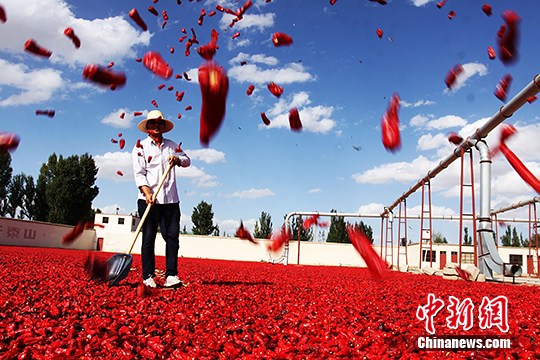 秋の実りに真っ赤に染まる砂漠の村 甘粛省 (2)