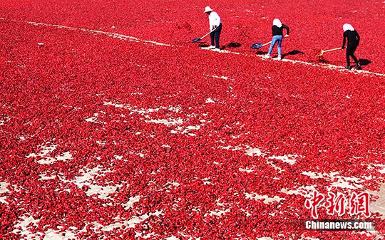 甘粛省西部の玉門(mén)市花海鎮(zhèn)とうがらし農(nóng)家協(xié)同組合の従業(yè)員が9月12日、真っ赤なとうがらしを乾燥させている。青い空、白い雲(yún)と赤いとうがらし。ゴビ砂漠に囲まれたオアシスにより一層彩りを添えている。中國(guó)新聞網(wǎng)が伝えた。(編集JK)