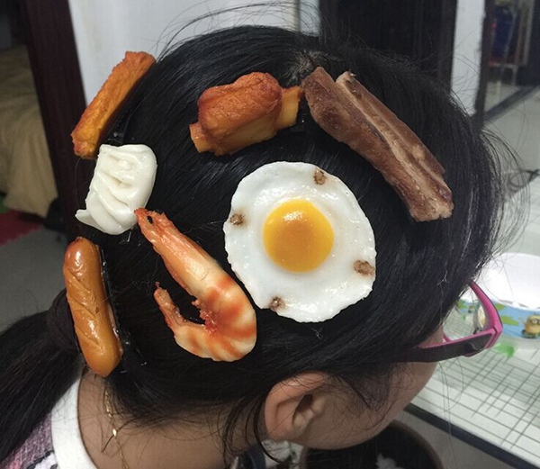今では、草花のヘアアクセサリーはもう「時代遅れ」。若者達(dá)の間で人気になろうとしている新しいヘアアクセサリーには、目を丸める人もいるだろう。中國の南方地域では現(xiàn)在、手羽先、豚の角煮、エビ、肉刺しなど、バラエティに富んだヘアアクセサリーが人気となっているのだ。「肉食系」という人ならソーセージ、ローストチキンなどのヘアアクセサリーを、「ベジタリアン」という人ならトウモロコシや目玉焼きなどのヘアアクセサリーをチョイスすることができる。