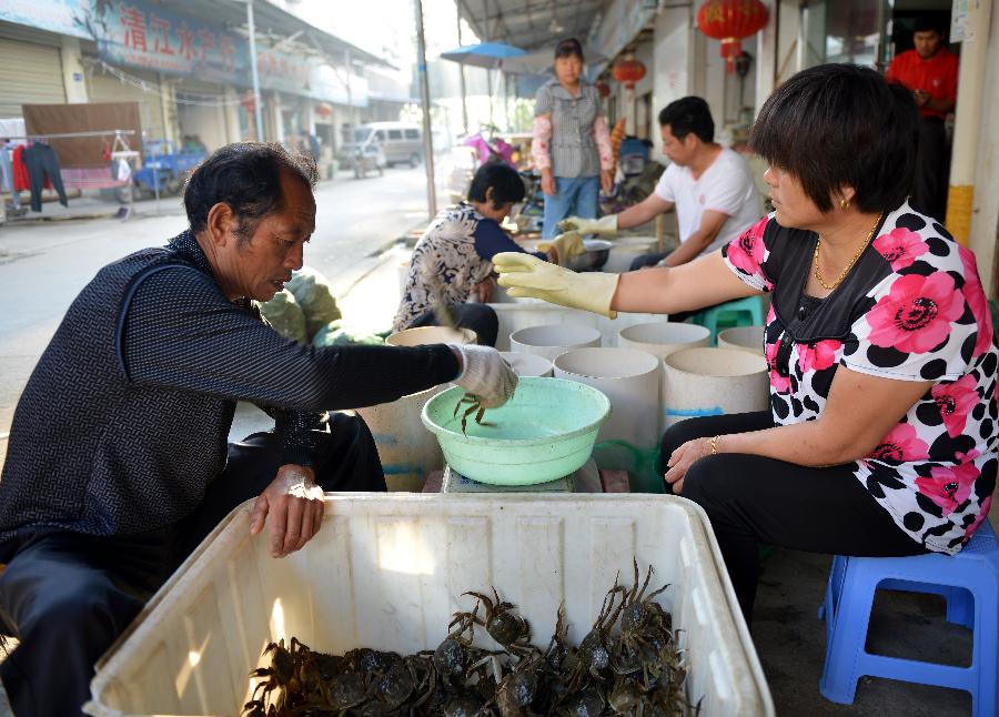 江蘇省淮安市洪沢県の洪沢湖水産卸売市場の店先には「上海ガニ」が積み上げられている。中秋節(jié)(十五夜、今年は9月27日)と國慶節(jié)(建國記念日、10月1日)を間近に控え、洪沢湖の「上海ガニ」販売市場は日を追って人気が出てきた。この數(shù)年、江蘇省洪沢県は洪沢湖の良質(zhì)な水資源を頼りに「上海ガニ」の養(yǎng)殖開発に力を入れてきた。