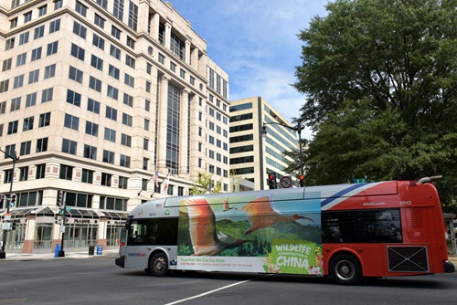 ワシントン中心部のホワイトハウス近くに停車していた「中國での野生動物保護」という広告が掲載された路線バス。