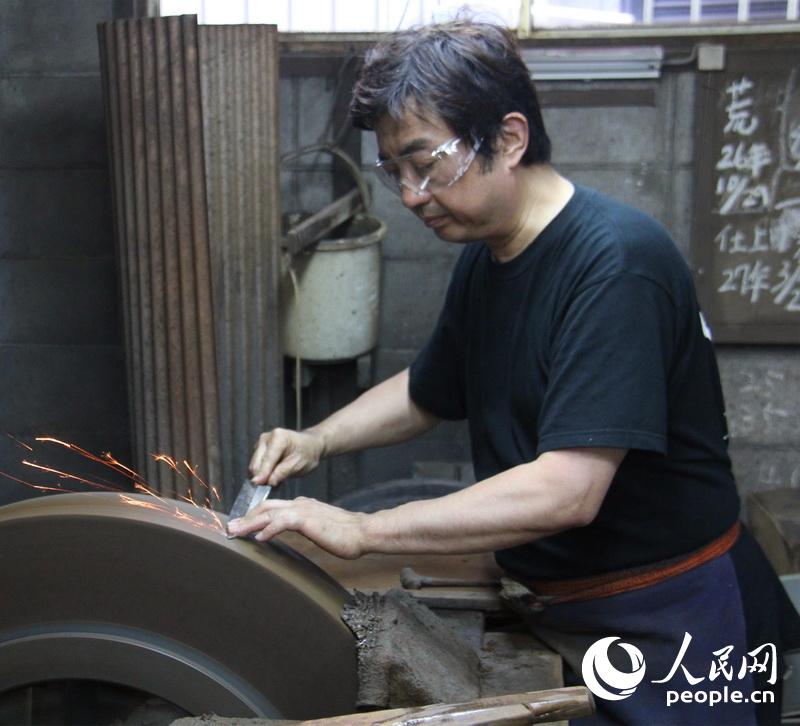 堺打刃物的の製造工程は大きく分けて鍛冶、研ぎ、柄付けの3工程。それぞれの職人が専門の技術(shù)をもって生産する分業(yè)制だ。堺打刃物を作る職人は毎日、約1000度の爐の前で、十?dāng)?shù)時間も仕事をしても、包丁を10本程度しか作れないという。堺市に住む山本英明さん(81)は、13歳の時に父から研ぎの技術(shù)を教わるようになった。山本さんの息子や孫も家業(yè)を継ぎ、堺打刃物を研ぐ職人として働いている。堺打刃物に夢中になり、大阪市で堺打刃物を?qū)熼Tに売る店を始めたアメリカ人もいる。