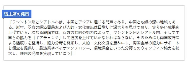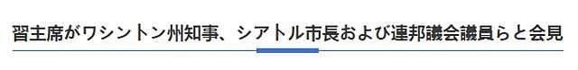 習(xí)主席は22日、シアトル市內(nèi)でインズリーワシントン州知事、エド?マレーシアトル市長(zhǎng)およびワシントン州連邦議會(huì)のパティ?マレー上院議員、ラーセン下院議員、駱家輝(ゲイリー?フェイ?ロック)元駐中國(guó)米國(guó)大使らと會(huì)見した。>>