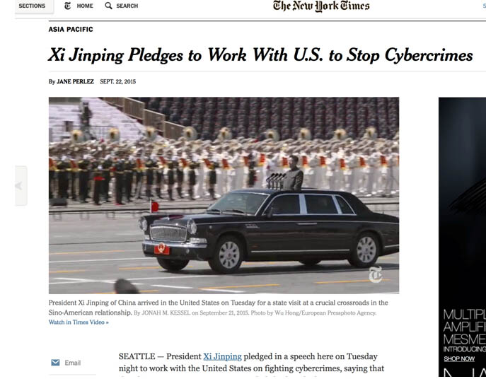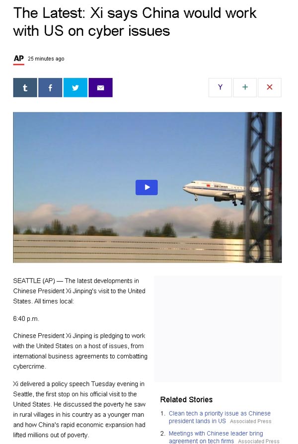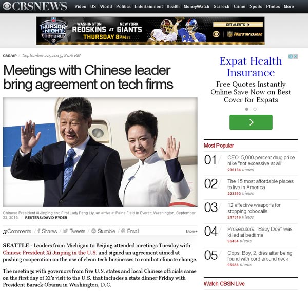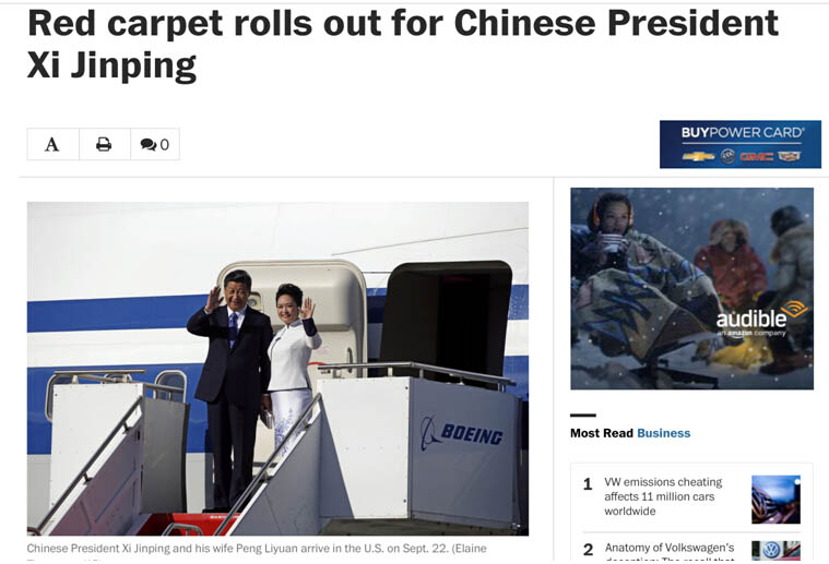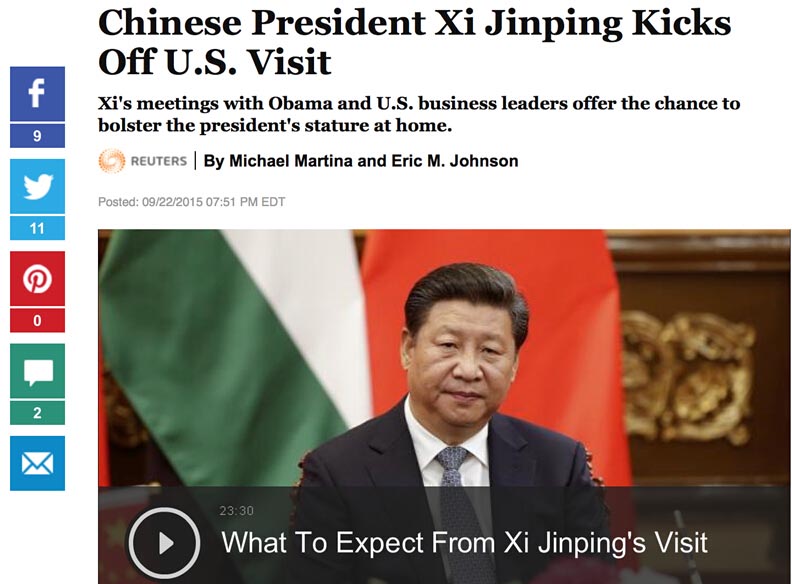 習近平國家主席が9月22日、専用機で北京を離れ、オバマ大統(tǒng)領の招待に応じ米國公式訪問を開始した。習主席は潘基文國連事務総長の招待を受け、ニューヨークの國連創(chuàng)立70周年の一連のサミットに出席する。習主席は同日、米國ワシントン最大の都市、シアトルに到著し米國公式訪問を開始した。歐米の主要メディアのウェブサイトはこの訪問に焦點を當て、集中的に紙面を割き、習主席の訪米を報道した。人民網(wǎng)が伝えた。(編集JK)