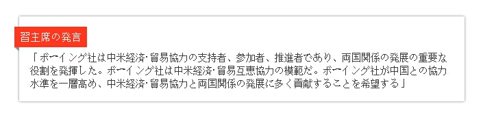 習(xí)主席は23日、シアトルでボーイング社の製造工場を見學(xué)した。習(xí)主席が到著すると、コナー民間航空機(jī)部門社長が企業(yè)の擔(dān)當(dāng)者と従業(yè)員代表を率いて手厚く出迎えた。コナー社長は習(xí)主席に會社の狀況を説明し、見學(xué)に隨行した。>>