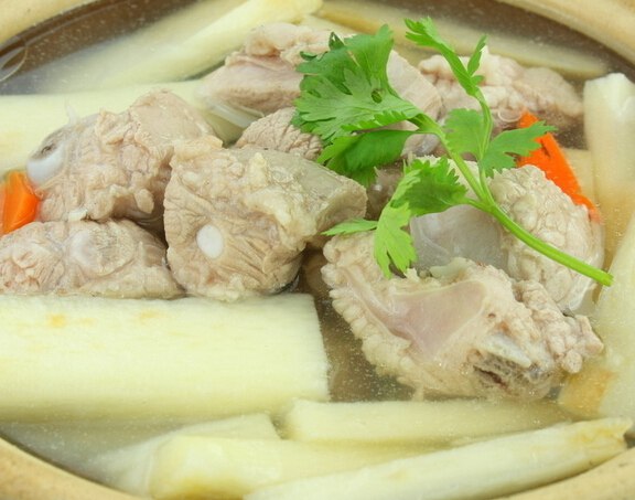 材料:骨付き肉400グラム、新鮮な山芋150グラム、乾燥みかんの皮の粉5グラム、ニンニク(皮を剝き、砕いたもの)15グラム、ネギのみじん切り5グラム、ごま油、酒、塩少々、砂糖、醤油、コーンスターチ、ピーナッツ油をそれぞれ適量。