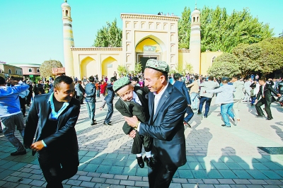 24日、新疆カシュガルの艾提尕爾広場(chǎng)で禮拝後に伝統(tǒng)的な「シャーマン踴り」を踴るムスリムの人々