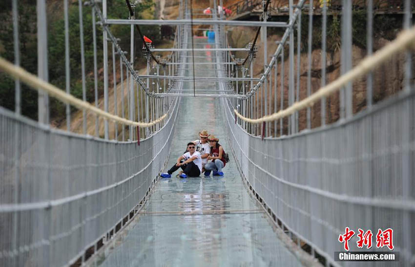 數(shù)名の観光客が9月24日、つり橋の上で足がすくんで動けなくなっている。同日、全長約300メートル、高さ180メートルの透明ガラスのつり橋が湖南省平江県石牛寨國家地質(zhì)公園に登場した。目下、中國初の透明ガラスのつり橋だ。中國新聞網(wǎng)が伝えた。(編集JK)