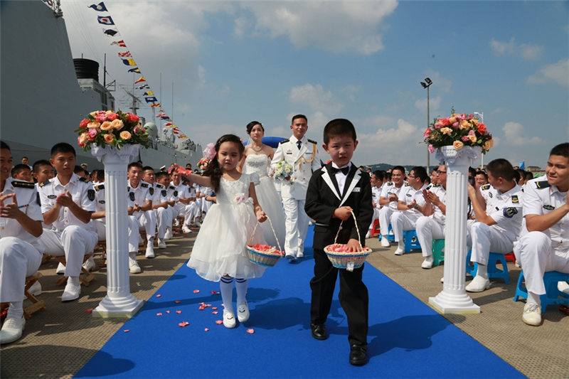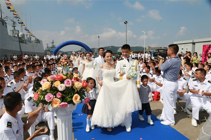 26日、東海艦隊某駆逐艦部隊の兵士27人が、浙江省舟山市の軍港で集団結婚式を開いた。可愛らしいフラワーボーイ?ガールや新婦と手をつなぎ、ウェディングマーチの軽やかなメロディーと共に、花や海のような青いじゅうたんで飾られた結婚の殿堂への道を歩んだ。チャイナネットが伝えた。