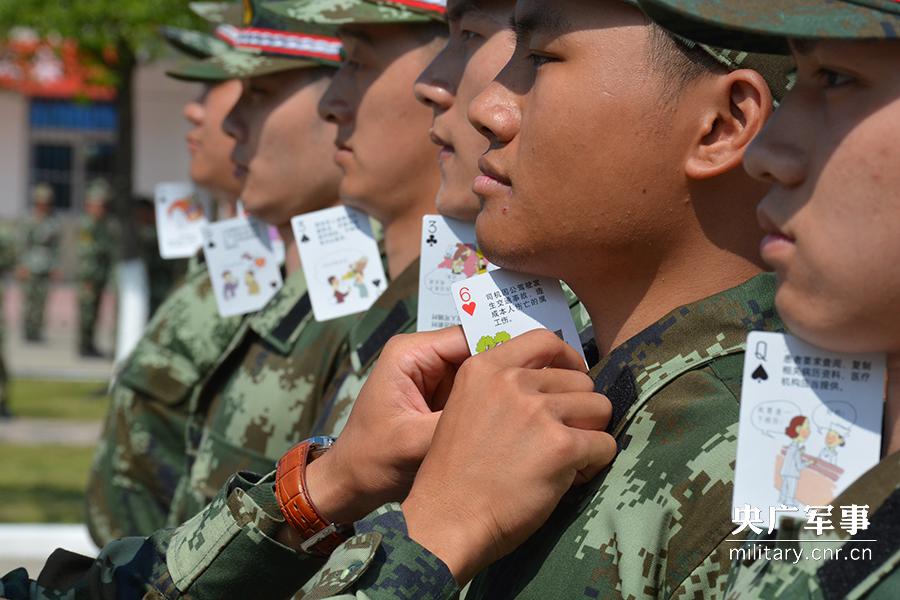 武裝警察安徽省総隊(duì)滁州市支隊(duì)の新人訓(xùn)練場(chǎng)では、地方から出てきたばかりの若き青年たちが班長(zhǎng)の引率のもと、厳しい「軍の洗禮」を受けている。新兵が入軍したのち、同支隊(duì)は「初期の基礎(chǔ)訓(xùn)練」の原則に従い、新人兵士で隊(duì)列を組み、體力測(cè)定などの基礎(chǔ)項(xiàng)目の訓(xùn)練を?qū)g施、時(shí)にゲームなどを織り交ぜ、楽しみながら「兵の基礎(chǔ)」を?qū)Wばせる。9月28日、武裝警察滁州市支隊(duì)の新人兵士は隊(duì)列訓(xùn)練の最中、模範(fàn)的な軍人の姿勢(shì)をとるため、トランプをあごに挾み練習(xí)している。中央放送網(wǎng)が伝えた。(編集JK)