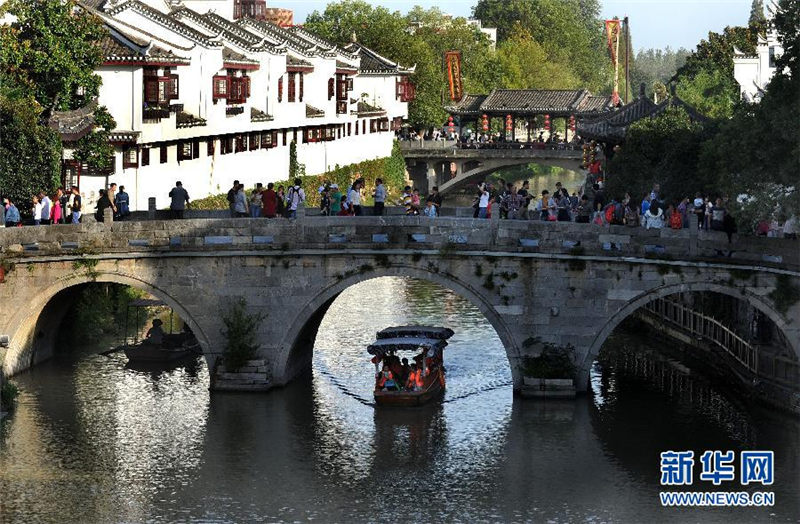 10月1日、安徽古鎮(zhèn)三河を見學する観光客。