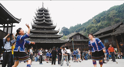 湖南省通道トン族自治県雙江鎮(zhèn)芋頭村トン寨で観光客のために歌舞を披露する村民。國(guó)慶節(jié)(建國(guó)記念日)長(zhǎng)期連休中、同県の各観光地は國(guó)內(nèi)の観光客を多く惹きつけている。(編集NA)