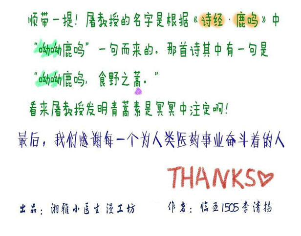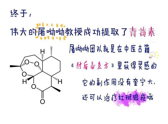 殷さんは電話取材に応じた際に、「屠氏の受賞の情報(bào)が伝わると、微信の友人グループとQQスペースに投稿が相次いだ。しかし多くの友人、特に醫(yī)學(xué)専攻ではない友人は専門知識に限りがあり、屠氏のマラリア治療の重大な貢獻(xiàn)を完全に深く理解していないことに気づいた。醫(yī)學(xué)を?qū)Wび、絵を描くことが好きな私は、イラストで屠氏の受賞理由を科學(xué)的に紹介した」と話した。(編集YF)